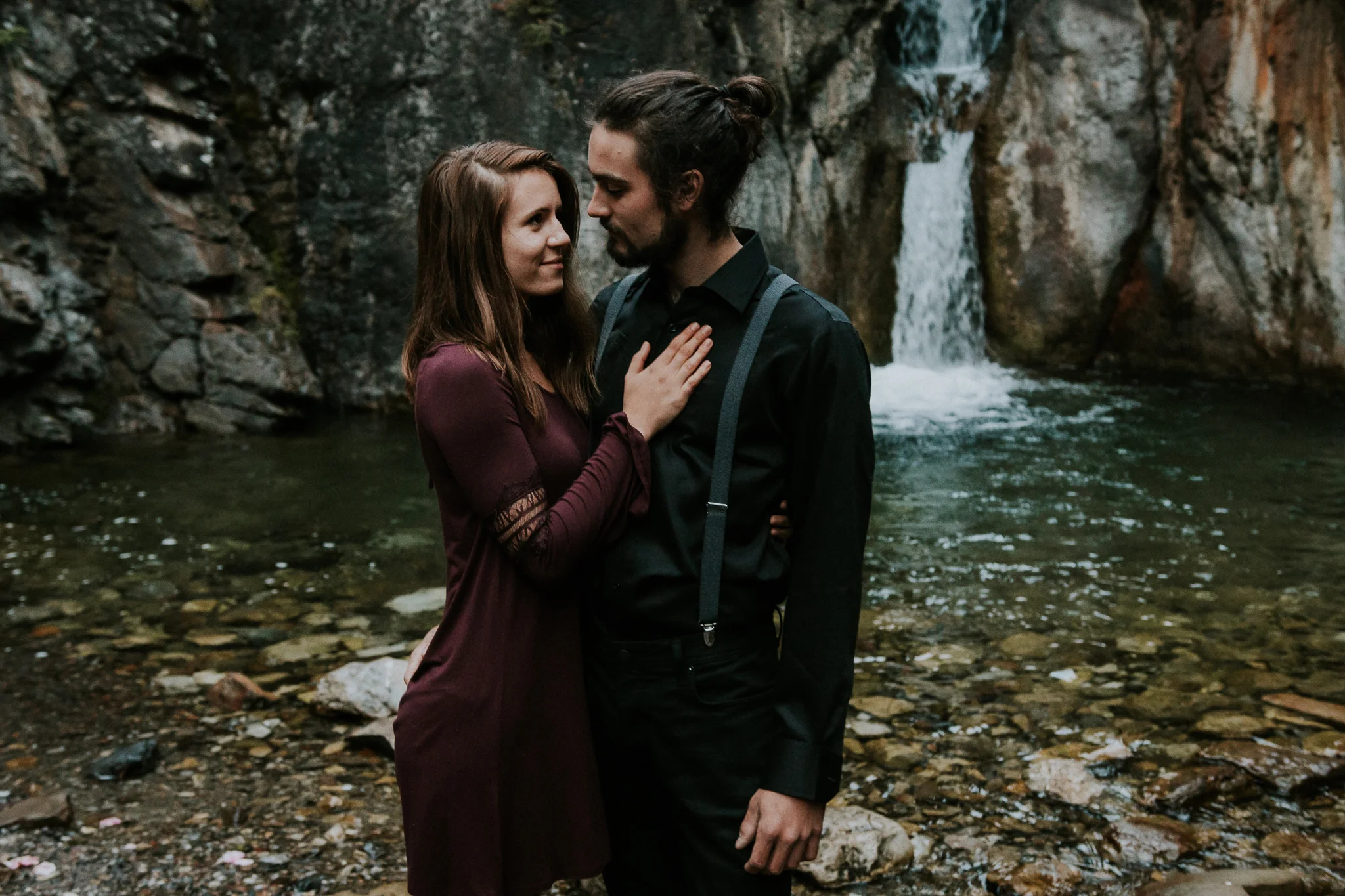 I met Sydney when I started working at Moxies after moving back to Calgary for the first time in 8 years. Unfortunately we only saw each other sporadically until Syd's last day at work when we got on the topic of yoga and spirituality. We realized we had a lot in common but not until it was too late! Luckily I've seen Sydney a couple of times since then and I was stoked when she was one of the two couples I gave away an Adventure Session with back in the spring. Caleb & Sydney are amazing parents to an adorable 3 year old and they love getting outside. They knew I am obsessed with waterfalls and suggested we do the session at Cat Creek Falls in Kananaskis. I had never been to this little spot before but it is amazing!! I will definitely be back next summer for a little swim in the falls. It's so nice discovering these amazing, mostly unknown gems close to home. Now, please enjoy some of my favourite photos of this beautiful couple from our session.