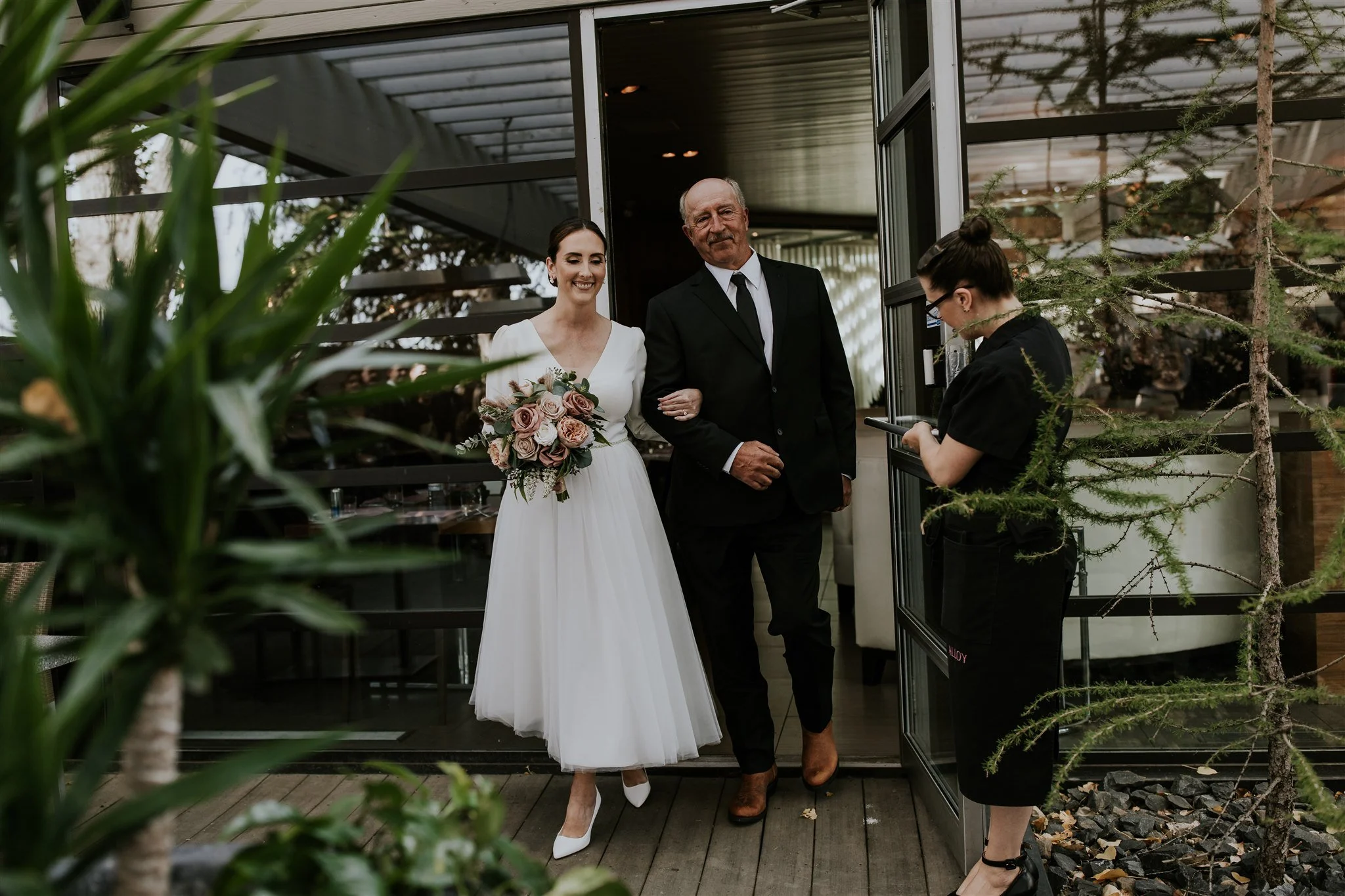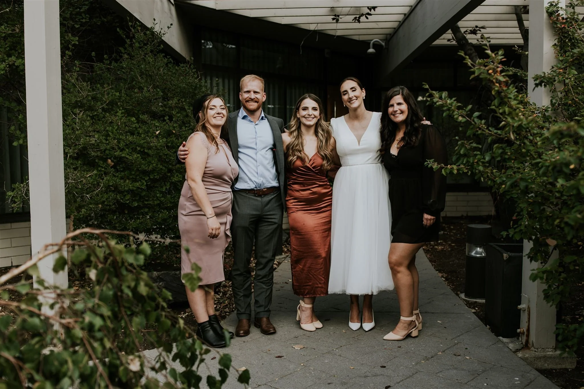 After our photo session, we headed to Alloy Restaurant for the ceremony and reception. Located in a somewhat industrial part of Calgary, Alloy gives off a cool, unexpected vibe that feels like being part of a secret club. The ceremony took place on their outdoor covered patio, surrounded by water features and greenery.