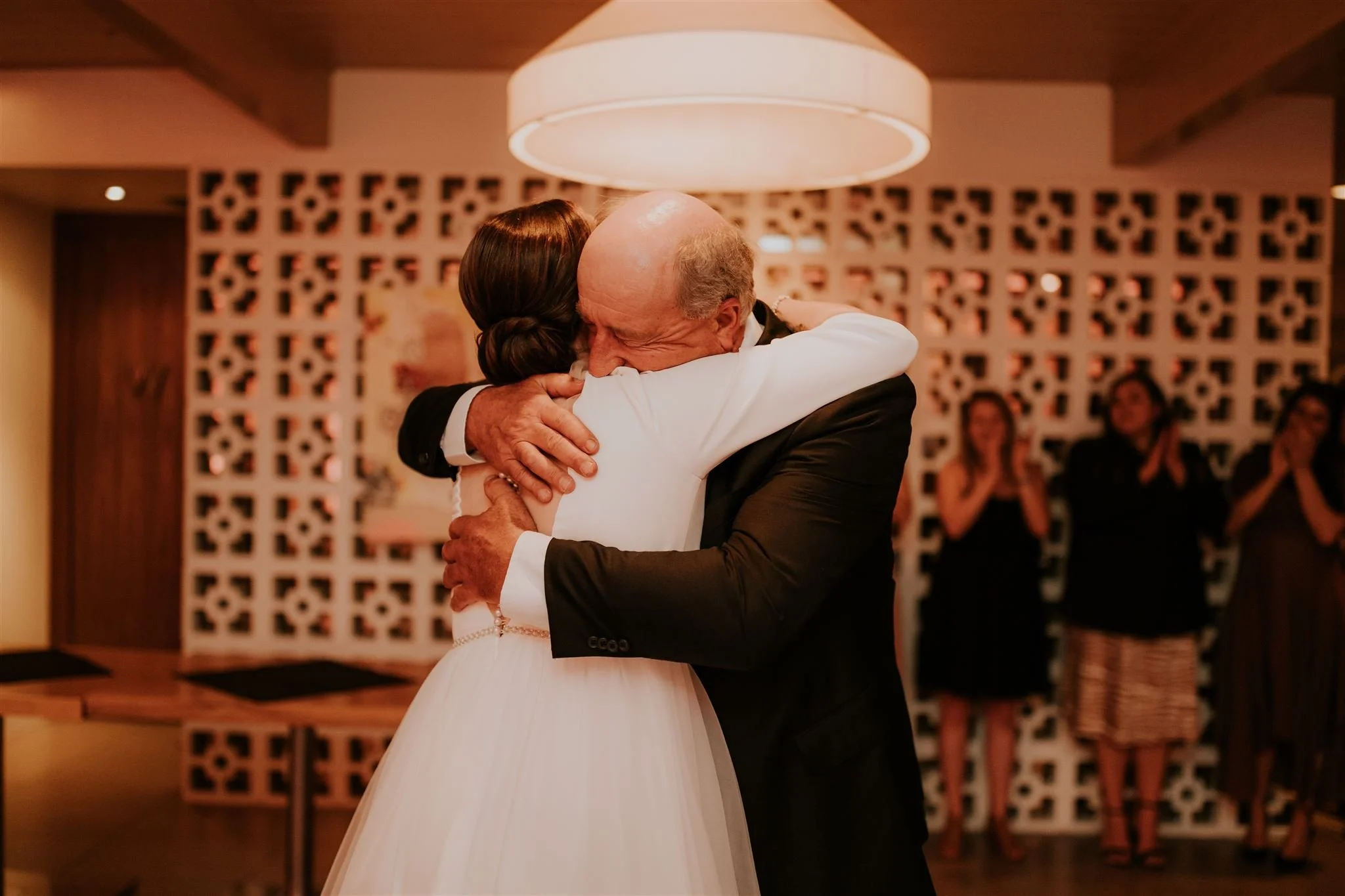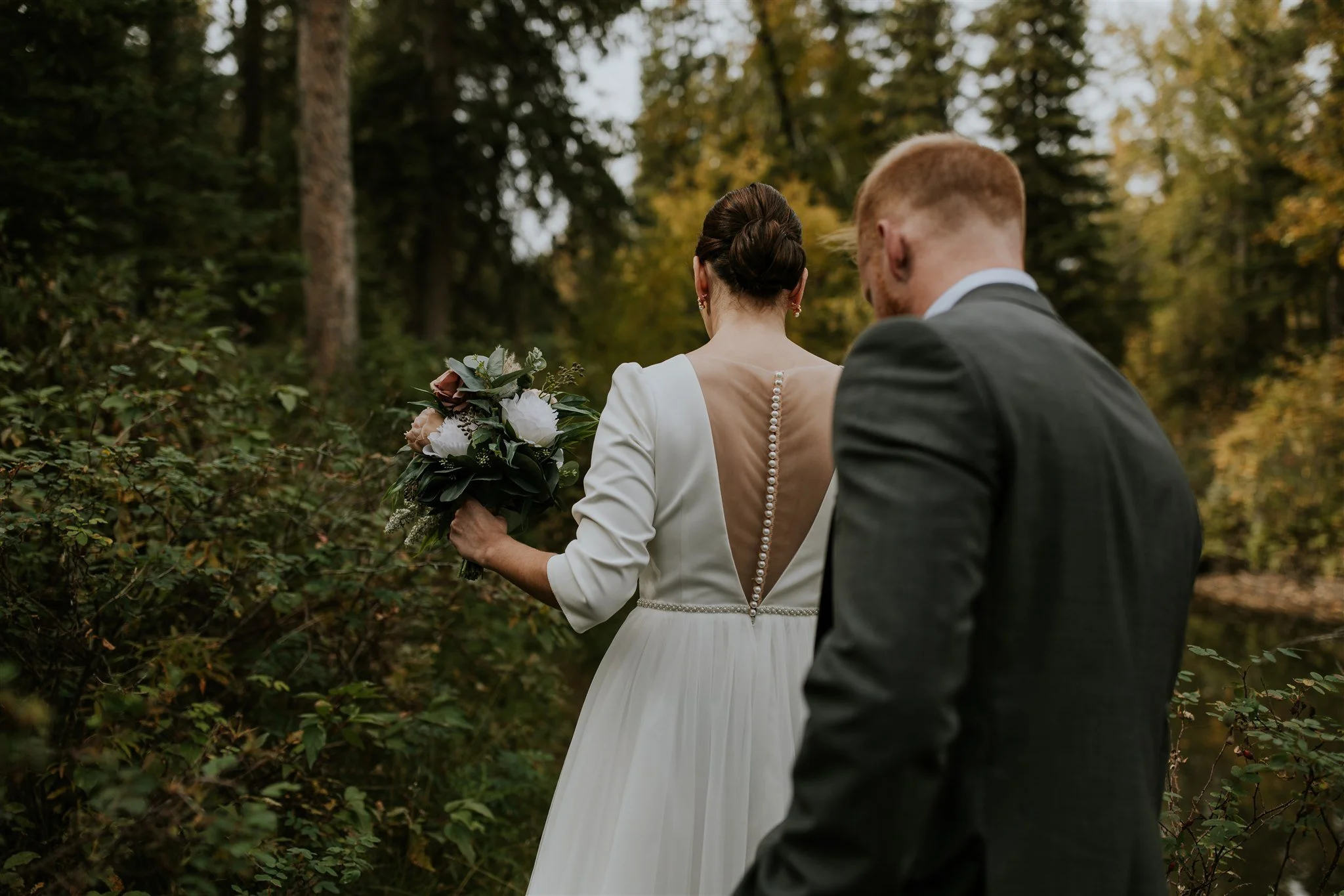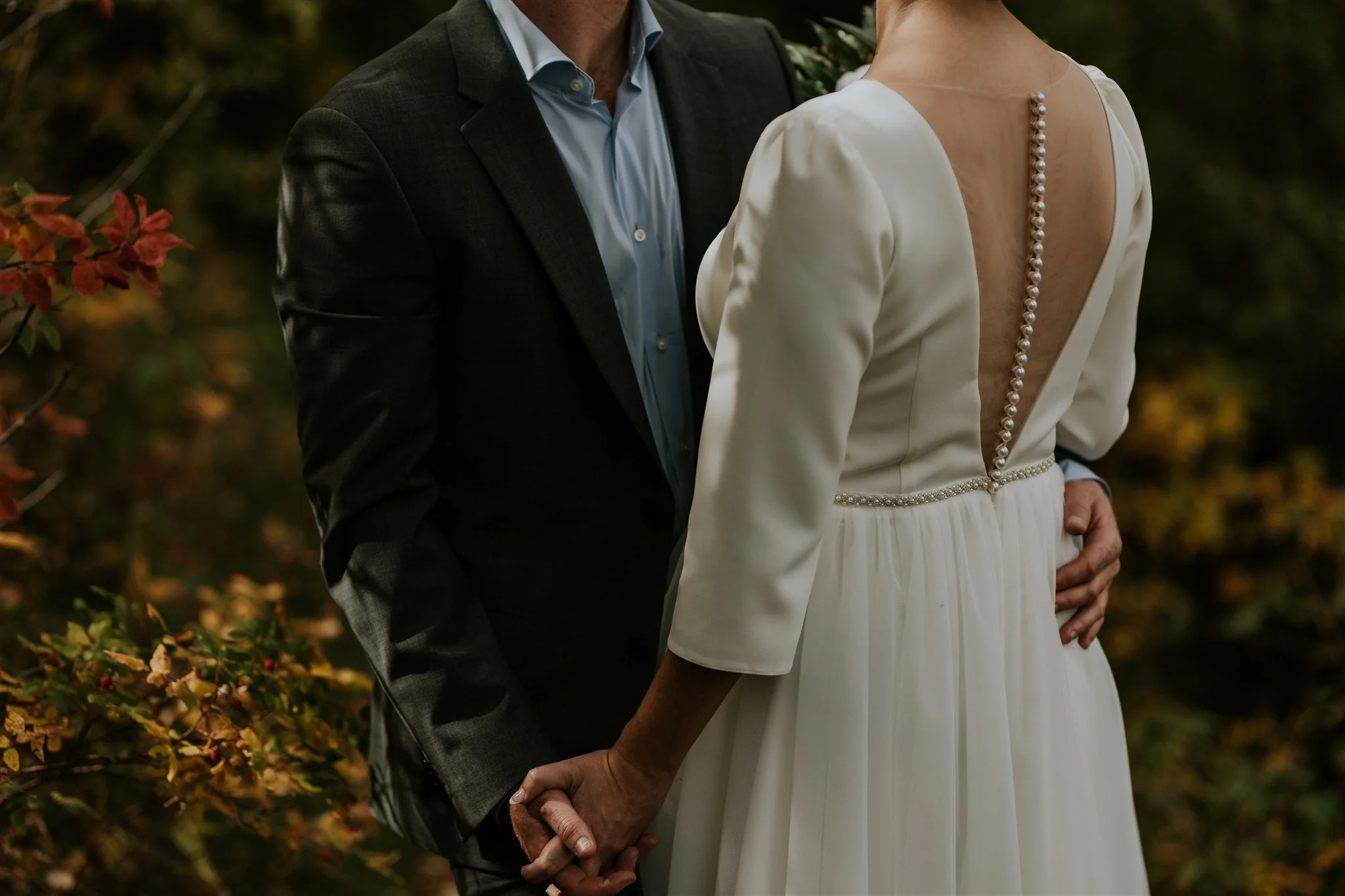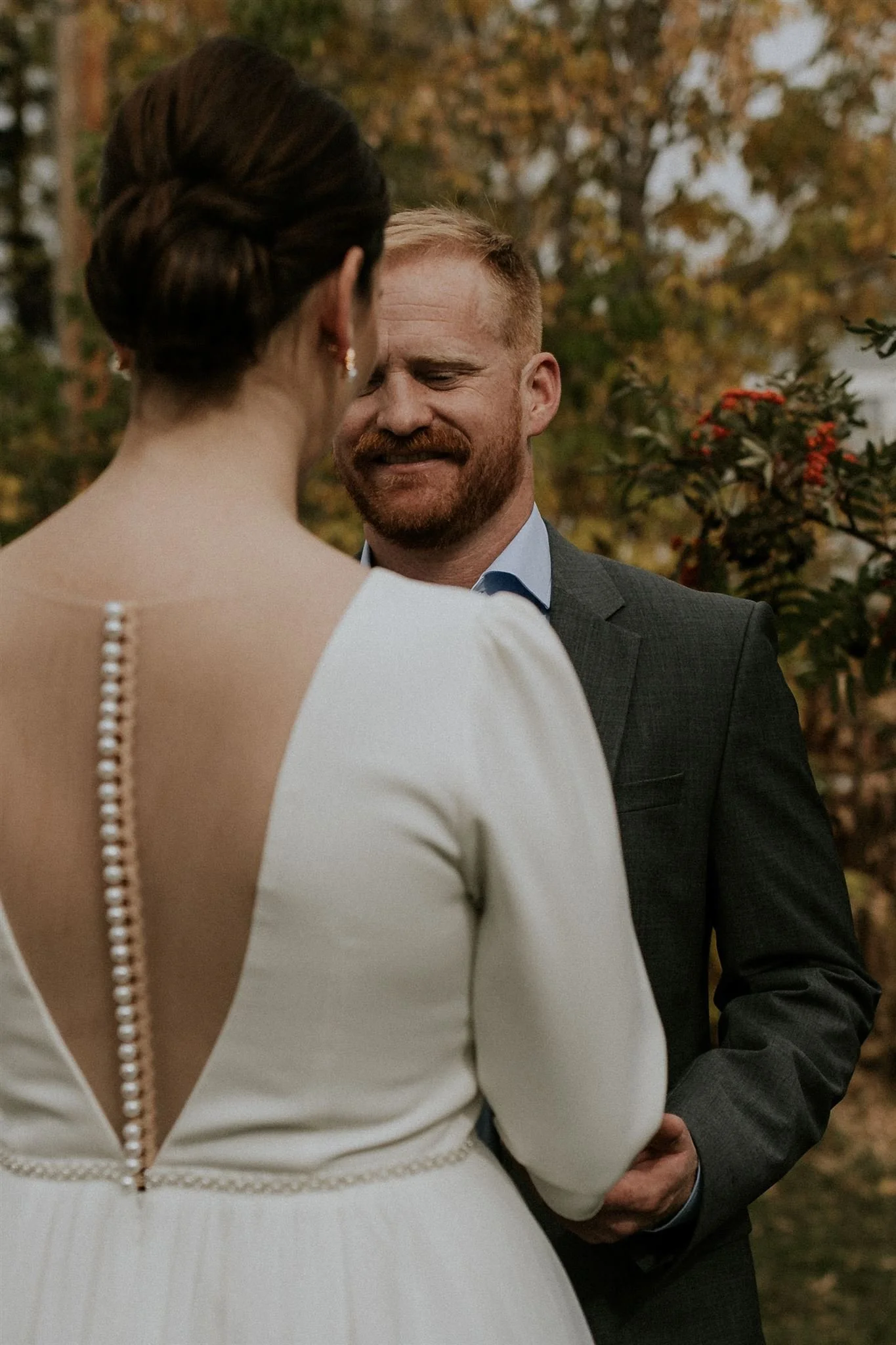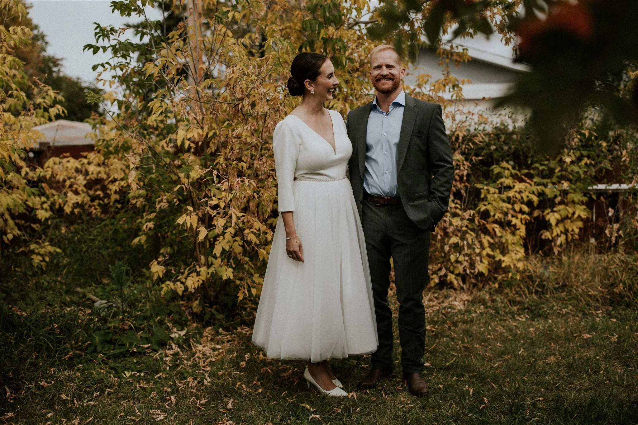 Imagine this: a backyard at the peak of its autumn foliage. Fall is my absolute favorite season in Calgary for weddings—cooler weather, longer light, and that crisp, fresh air. Ashley looked stunning with her hair and makeup done by the talented Studio Haven, and her look stayed flawless all day. First came a first look with her mom and dad (the cutest!), and then finally, Brian saw his bride-to-be for the first time that day. TEARS ENSUE.