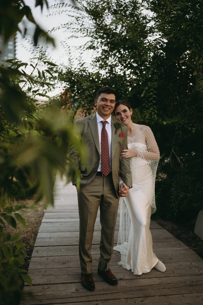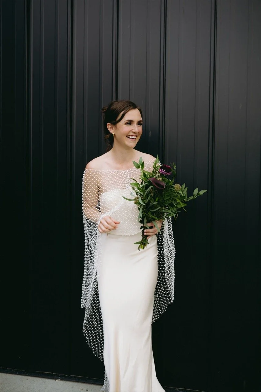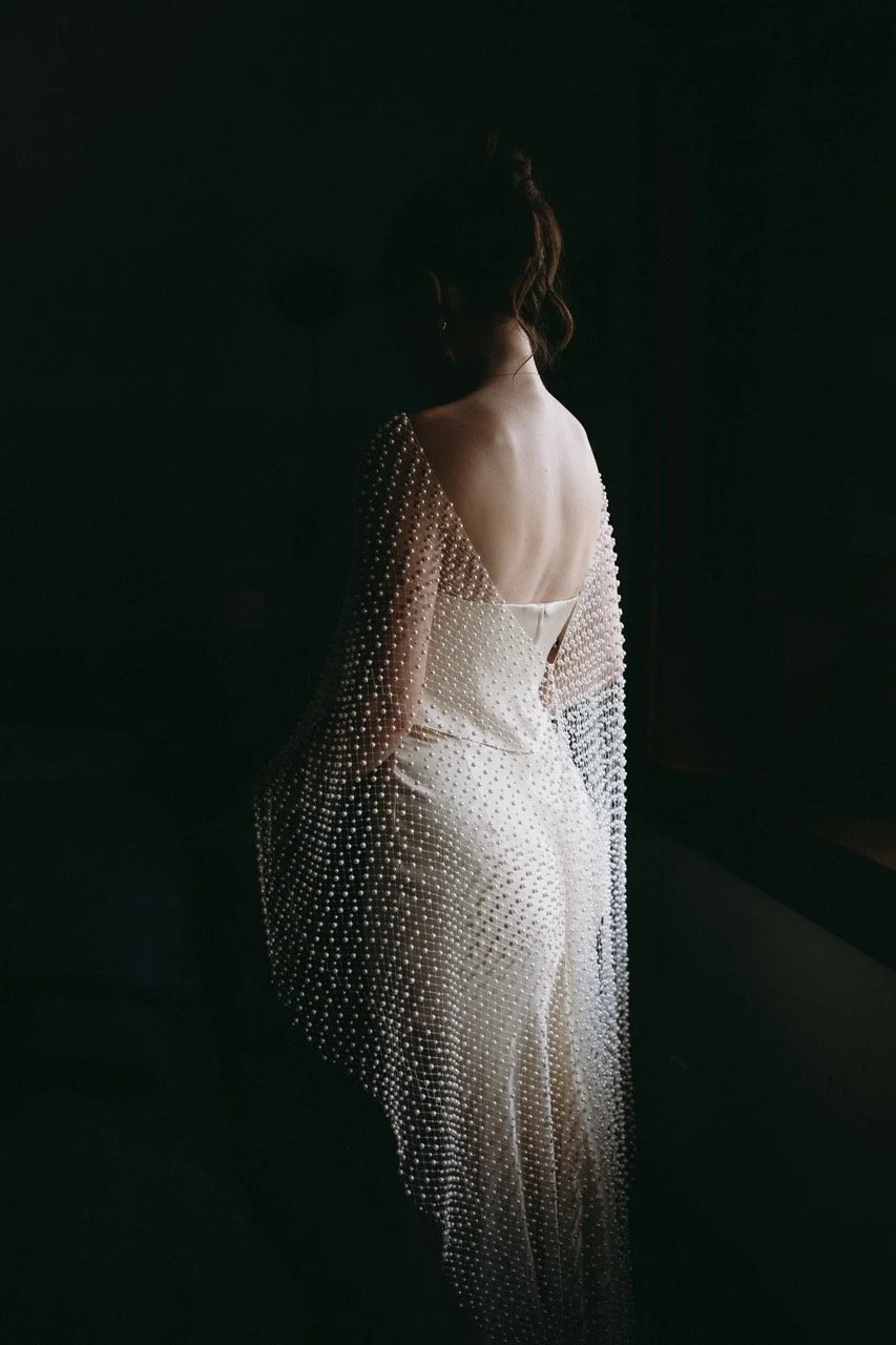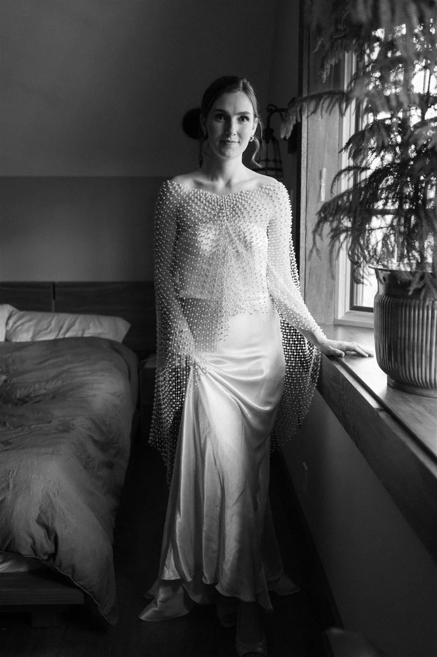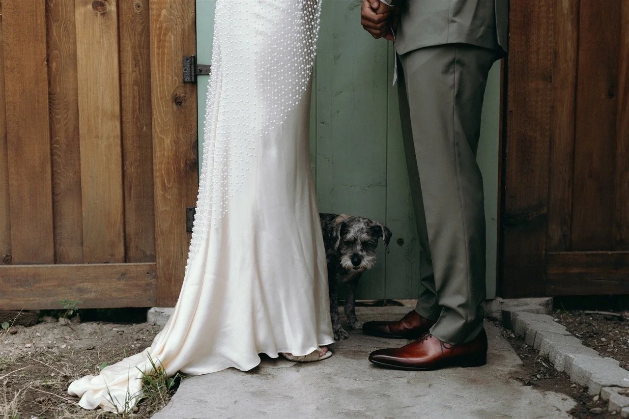 The day began at Gabe & Alex’s home, surrounded by their closest friends and three beloved dogs, setting the tone for a warm, connected celebration. Each friend played a role in making sure everything was perfect, from helping Alex with his suit and tie to assisting Gabe with her stunning pearl cape. (As a wedding photographer, I’m not shy to admit I was internally screaming with excitement photographing that cape—it’s one of my favorite accessories I’ve seen in years!)