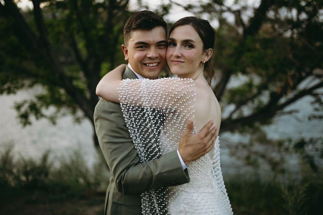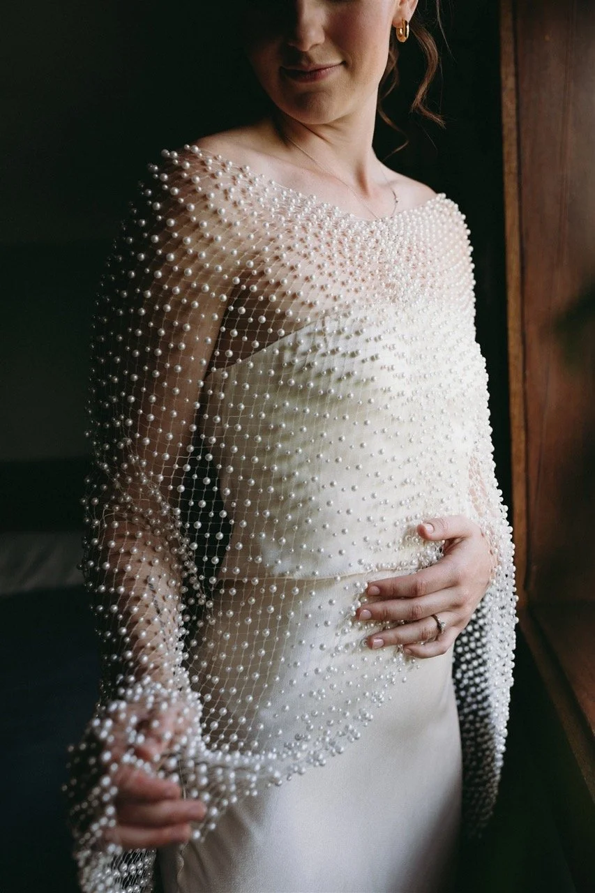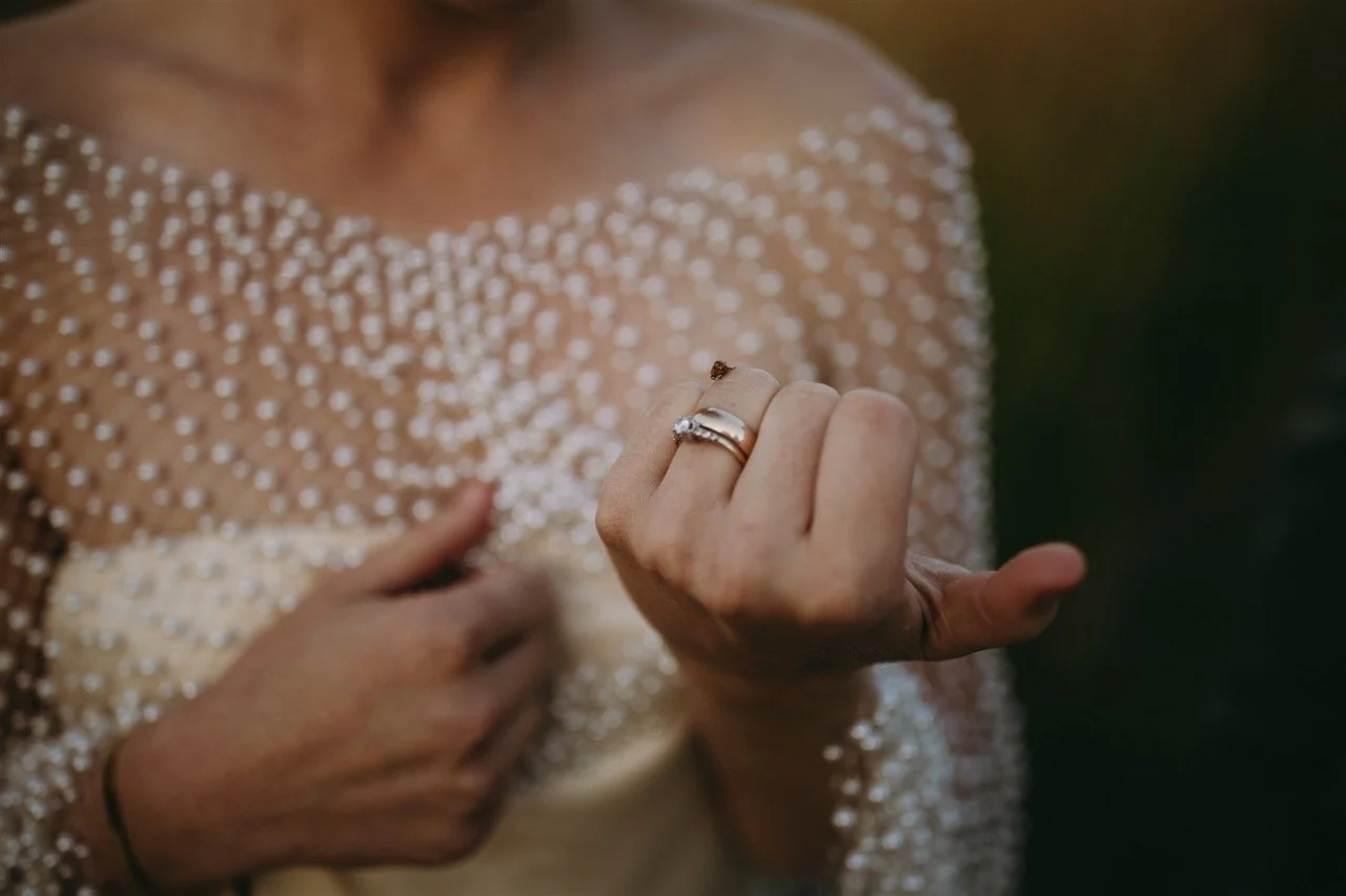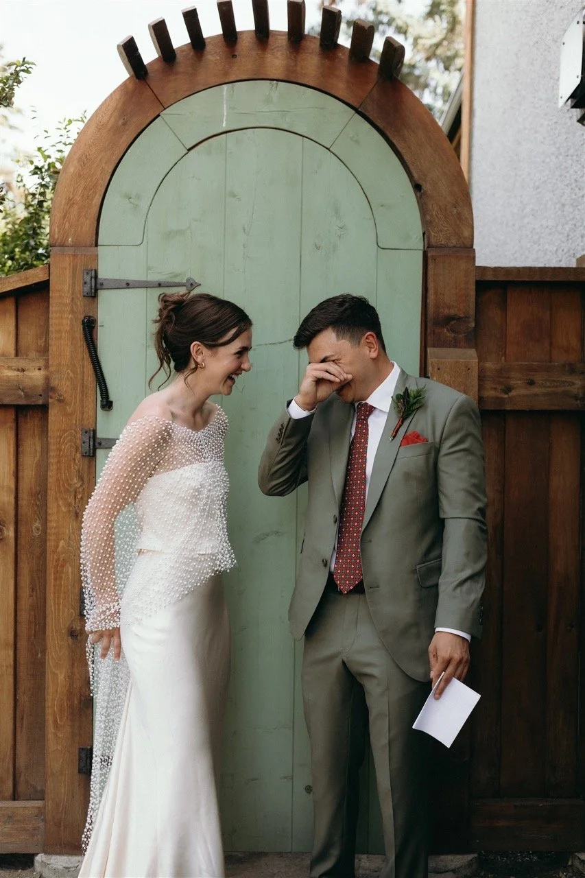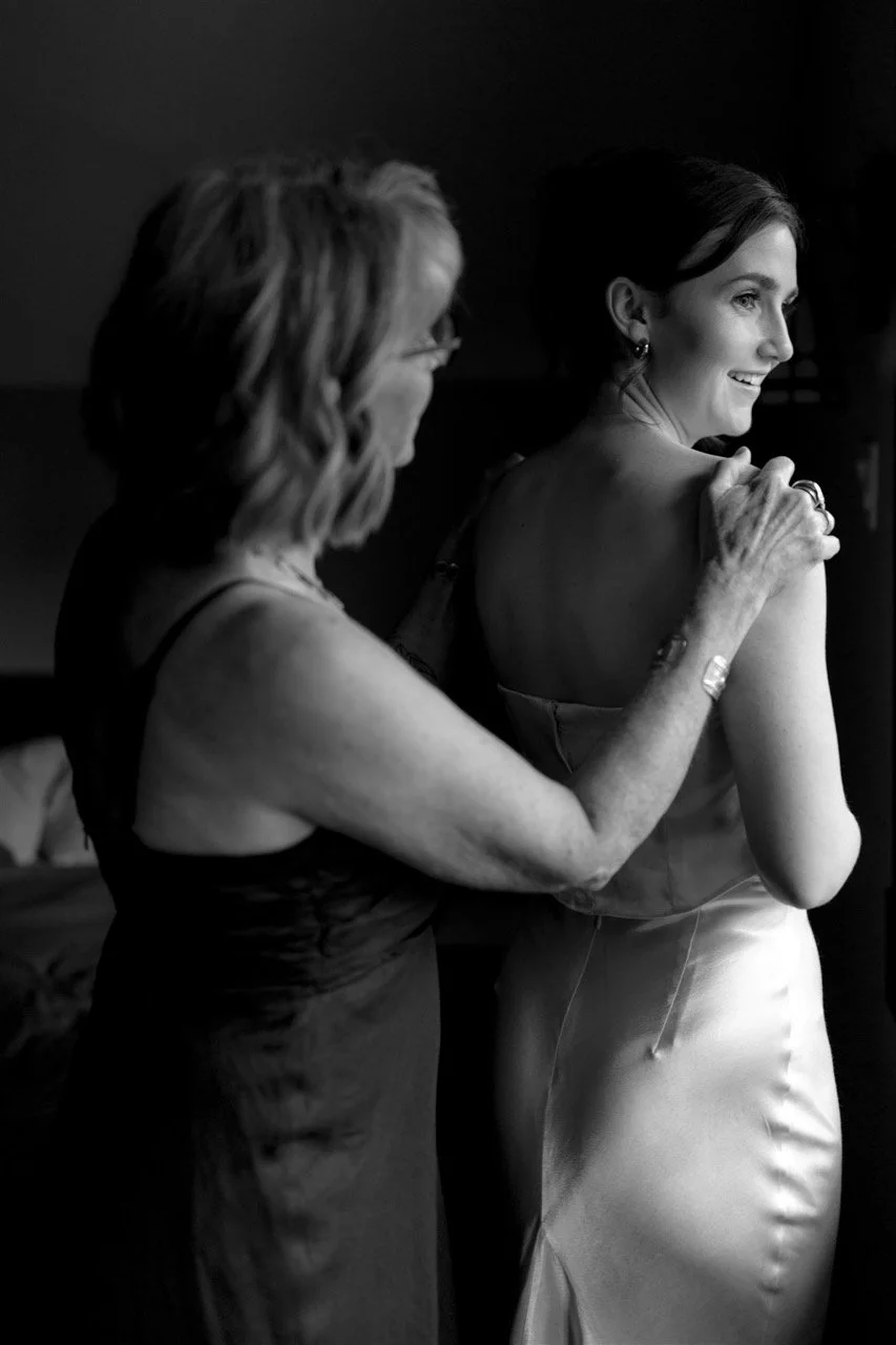 The day began at Gabe & Alex’s home, surrounded by their closest friends and three beloved dogs, setting the tone for a warm, connected celebration. Each friend played a role in making sure everything was perfect, from helping Alex with his suit and tie to assisting Gabe with her stunning pearl cape. (As a wedding photographer, I’m not shy to admit I was internally screaming with excitement photographing that cape—it’s one of my favorite accessories I’ve seen in years!)