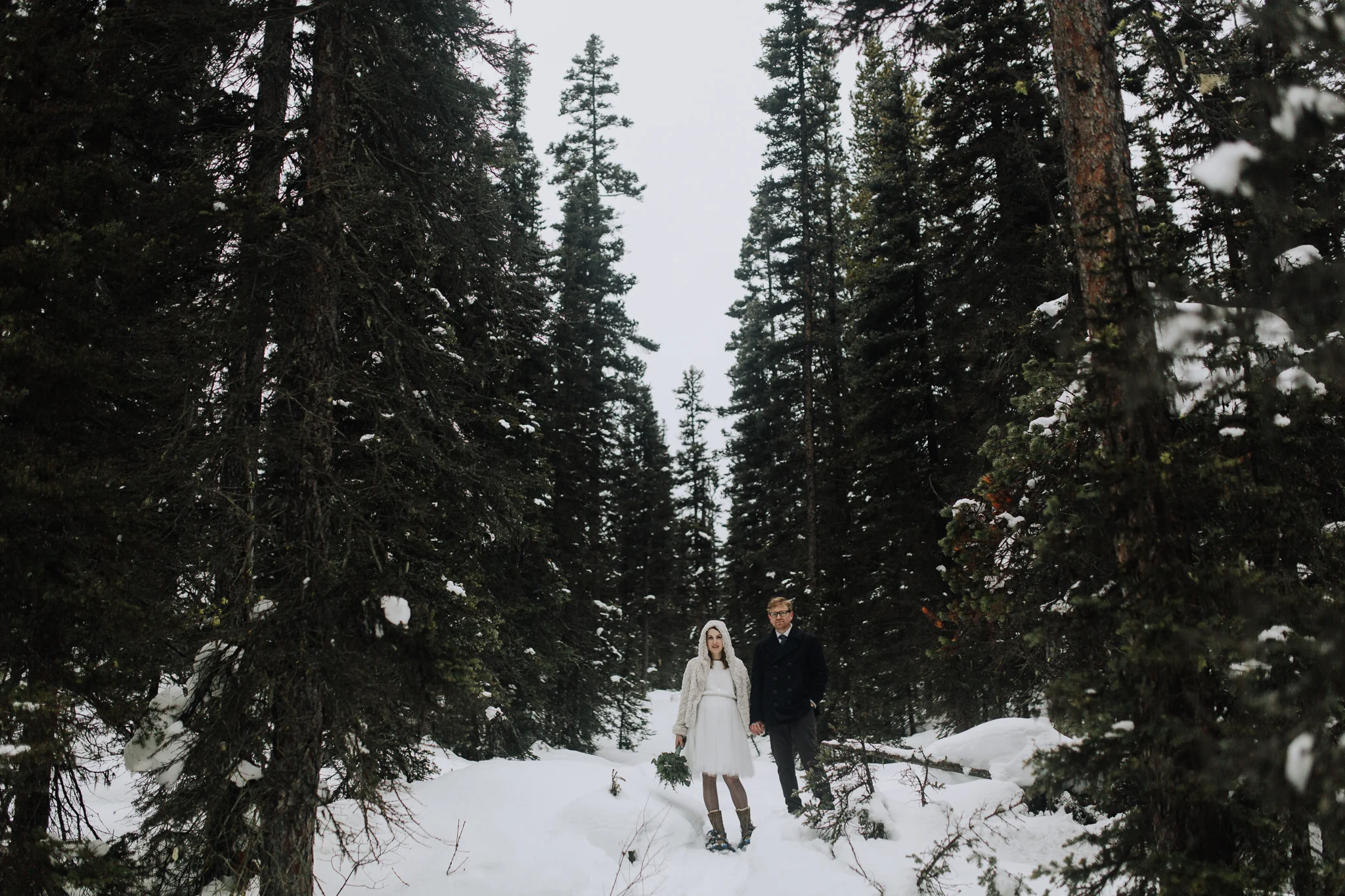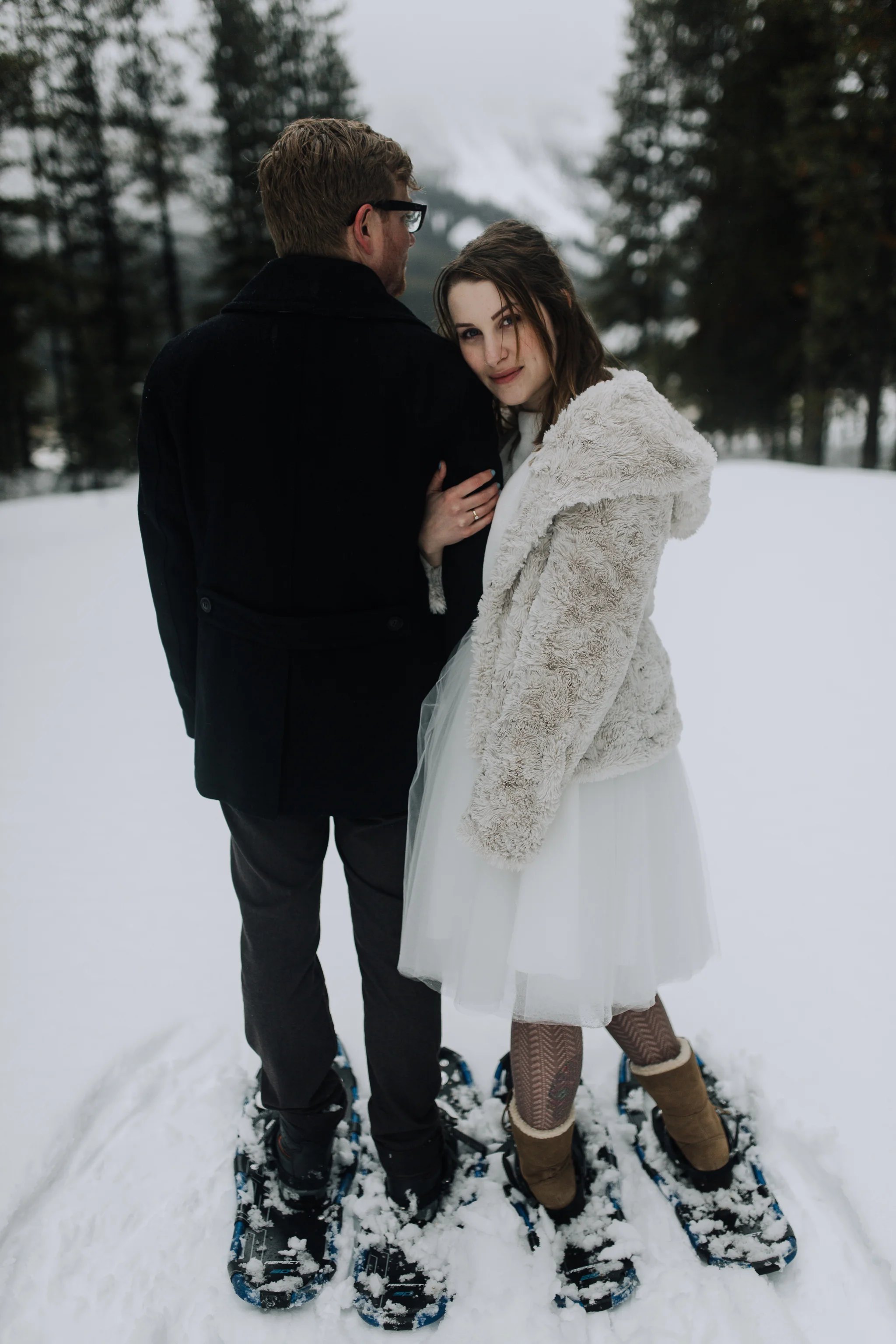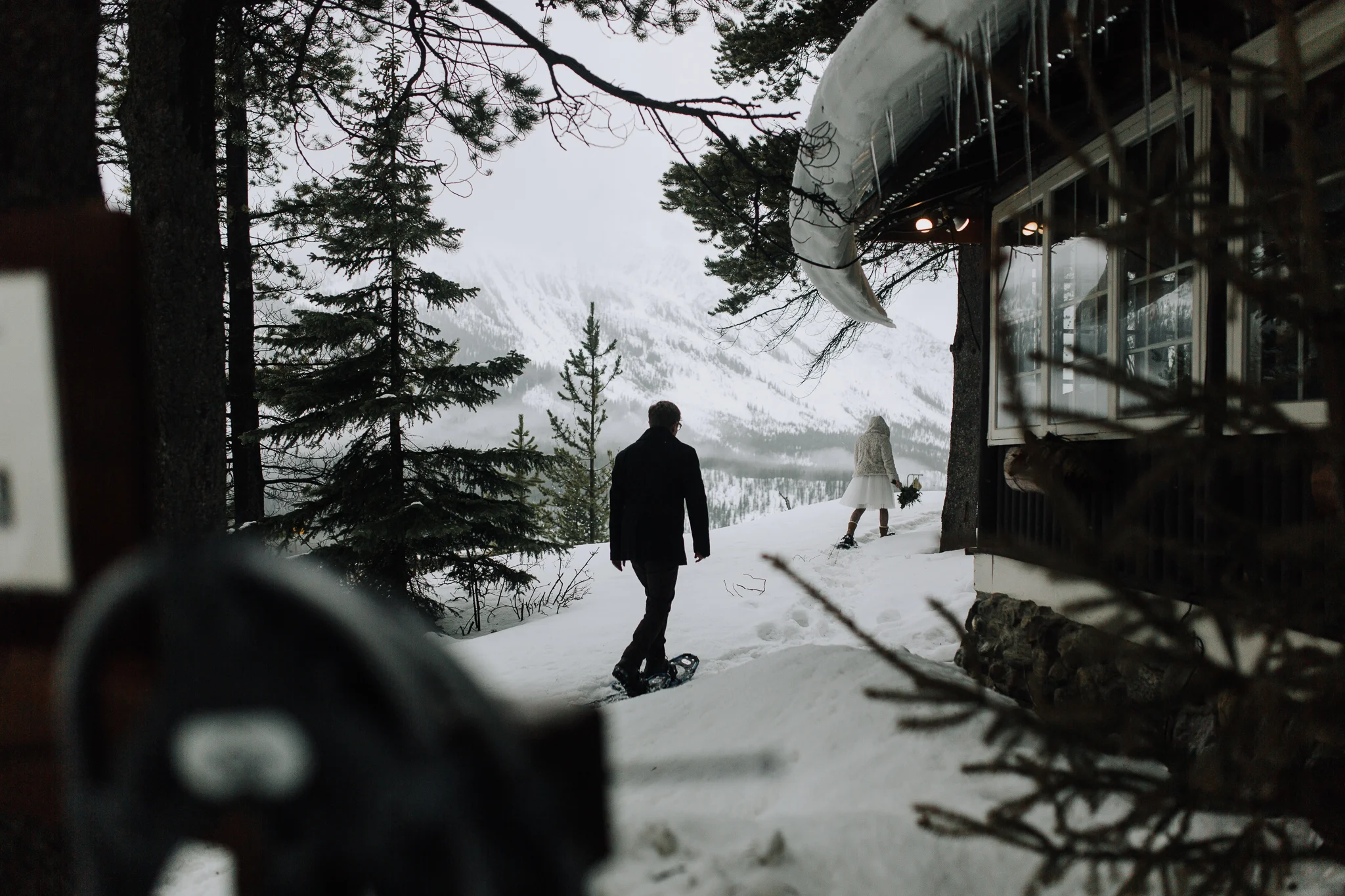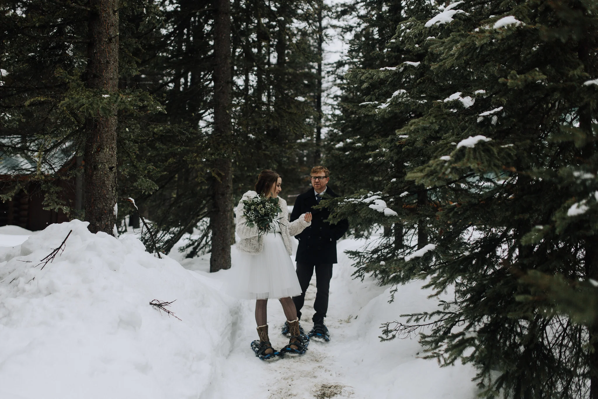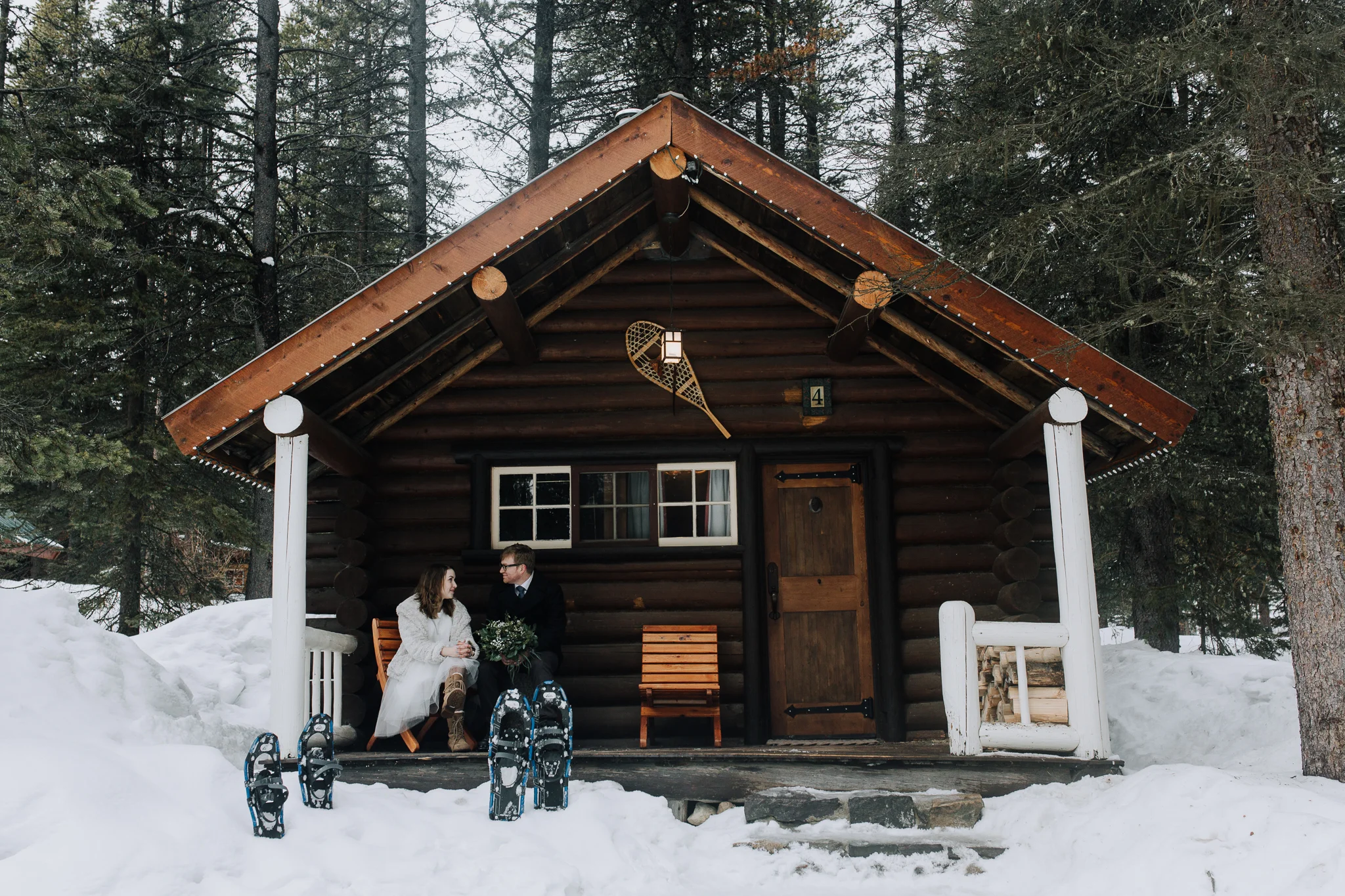 A few months ago I was contacted by Dawn & Rob about shooting their intimate Banff elopement at Storm Mountain Lodge. Hidden off the side of Highway 93 in Banff National Park, Storm Mountain Lodge is one of those intimate wedding venues that every photographer dreams of shooting at. Guests stay in individual log cabins scattered through the property. They are cosy and cute and the perfect location for a magical winter elopement in Banff. Dawn & Rob had discovered me through Instagram, which was a first for me! We met for coffee to chat about their Banff elopement plans and instantly hit it off. One of my favourite memories was when I got up to use the bathroom and came back to Rob exclaiming, "I know you've only been gone 2 minutes but we've already had a change of plans! We want you to join us for dinner at the lodge after the wedding!" That was when I began to learn just how friendly and inviting these two and their closest friends are. At no point during the day did I feel like "the photographer", more like an old friend third wheeling Rob & Dawn on a snowshoeing date through the snowy forest! The ceremony lasted a grand total of 7 minutes on the front porch of their cute cabin and was witnessed by myself and 3 other people. It was intimate and meaningful and just for the two of them, which accurately describes the entire day. I may have been the only single person at this Banff elopement, but being surrounded by such genuine and unconditional love was incredibly refreshing. I can only hope to encounter such a love myself one day! Congrats again, Rob and Dawn and I'll see you at the Loose Moose sometime soon!