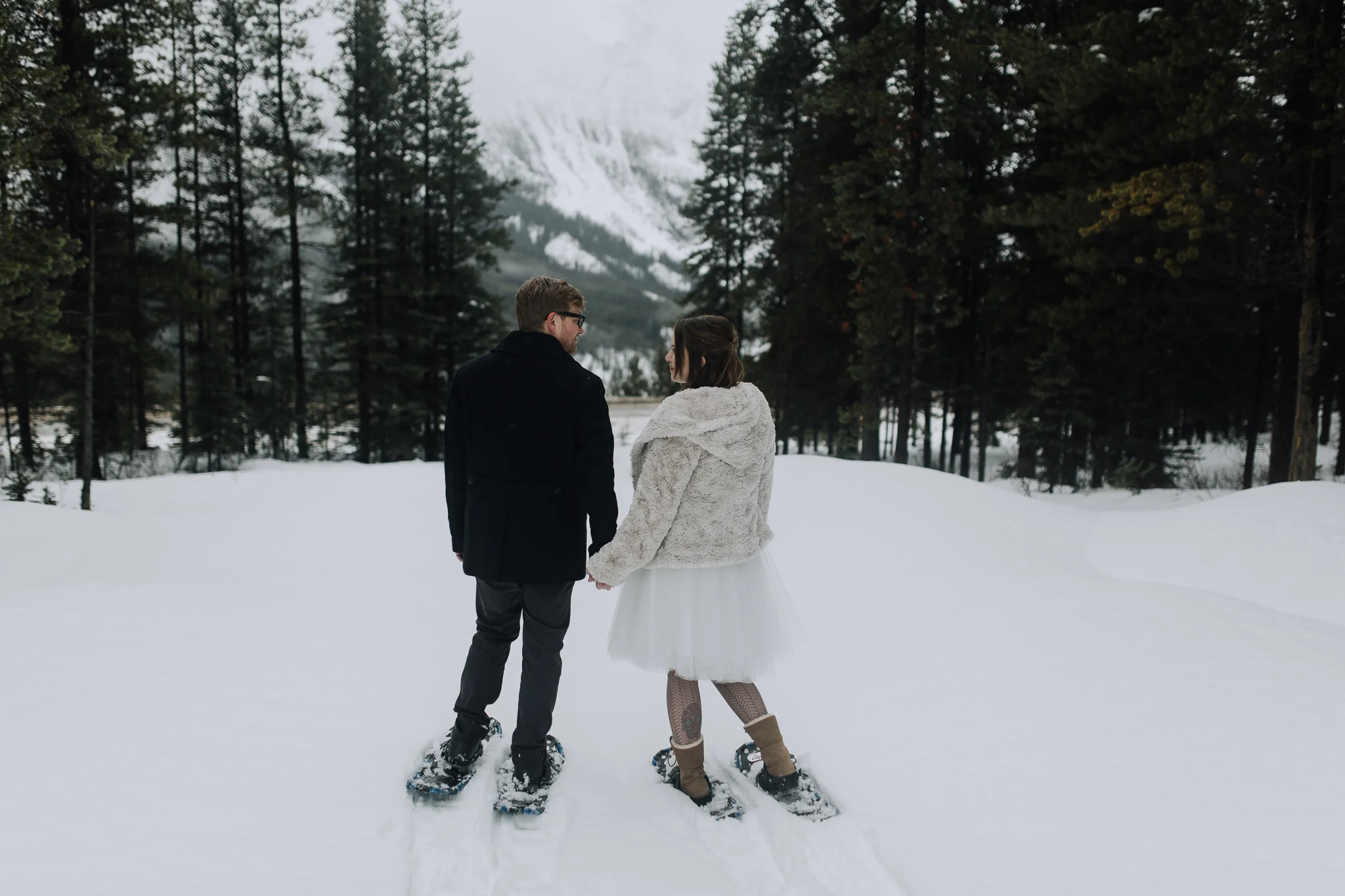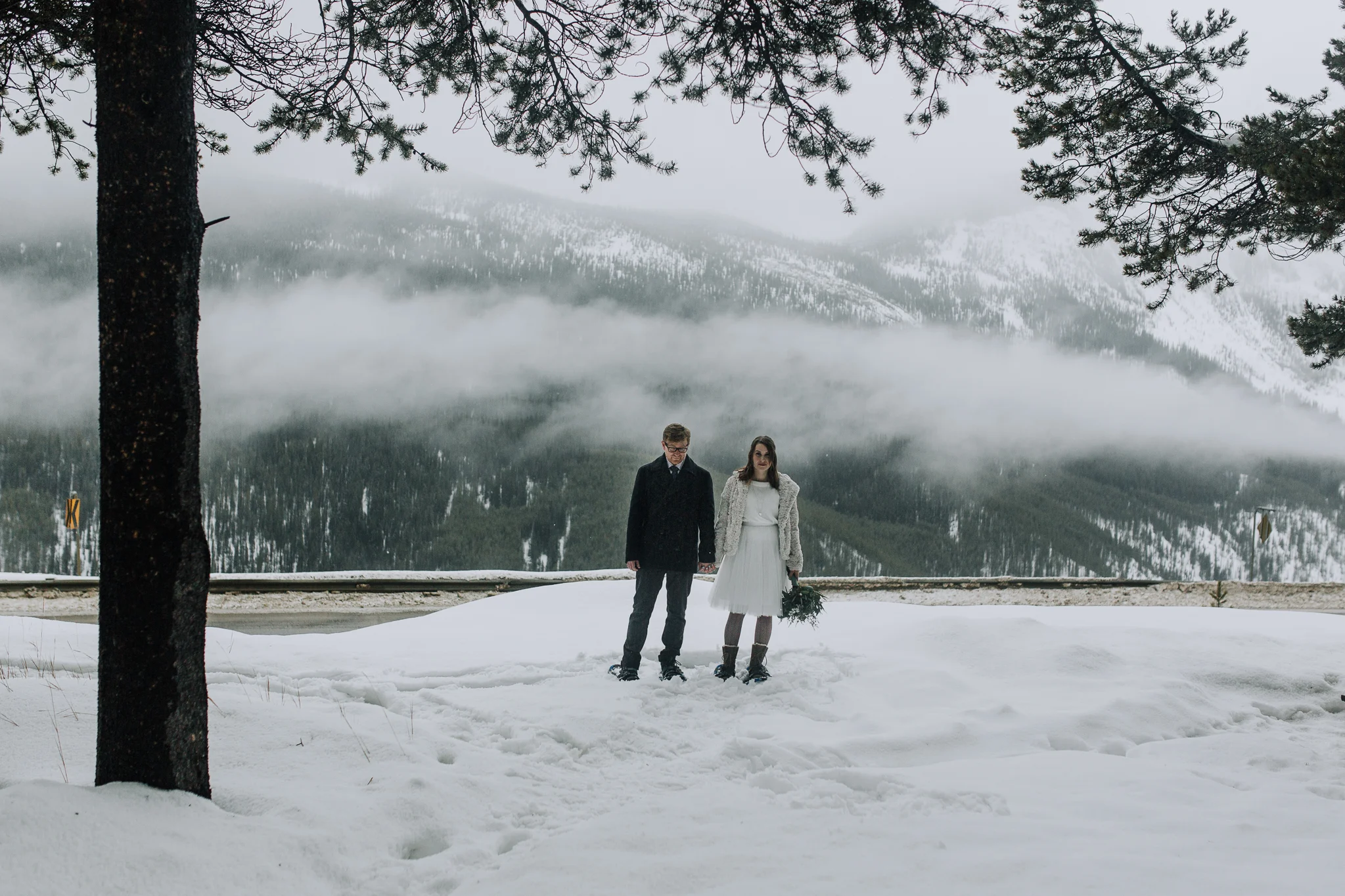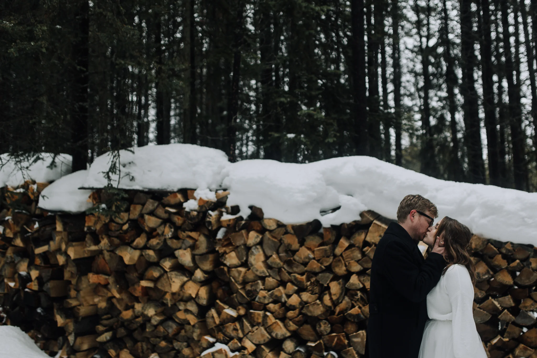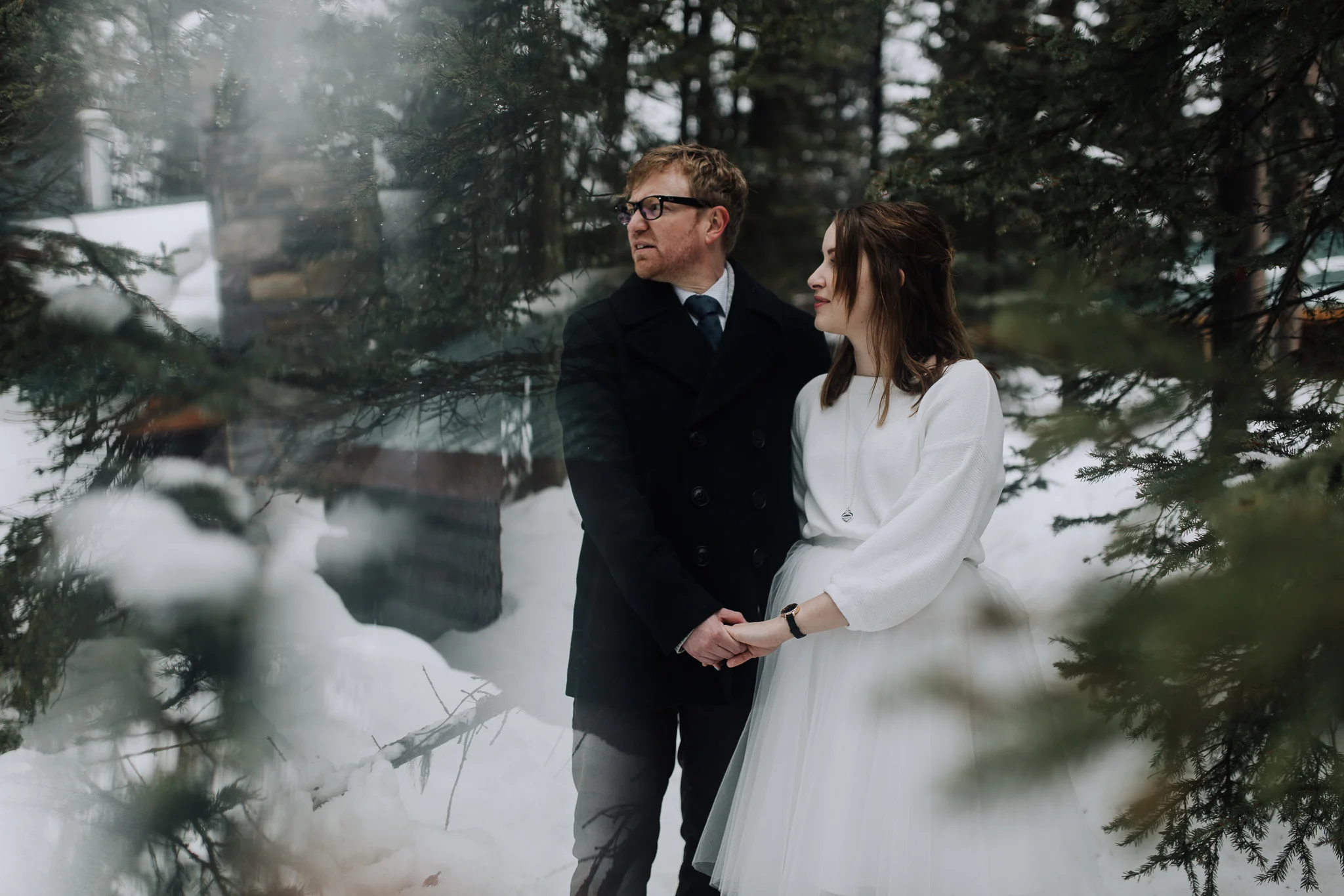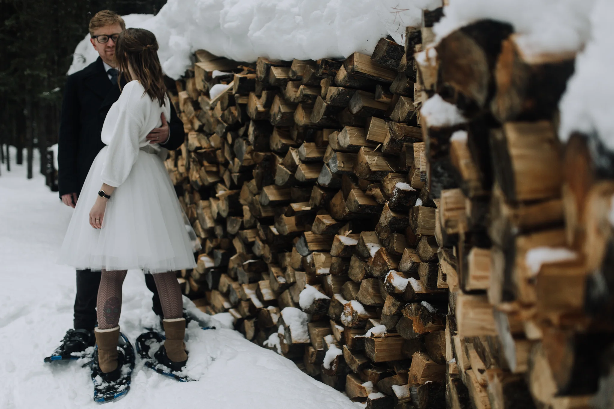 A few months ago I was contacted by Dawn & Rob about shooting their intimate Banff elopement at Storm Mountain Lodge. Hidden off the side of Highway 93 in Banff National Park, Storm Mountain Lodge is one of those intimate wedding venues that every photographer dreams of shooting at. Guests stay in individual log cabins scattered through the property. They are cosy and cute and the perfect location for a magical winter elopement in Banff. Dawn & Rob had discovered me through Instagram, which was a first for me! We met for coffee to chat about their Banff elopement plans and instantly hit it off. One of my favourite memories was when I got up to use the bathroom and came back to Rob exclaiming, "I know you've only been gone 2 minutes but we've already had a change of plans! We want you to join us for dinner at the lodge after the wedding!" That was when I began to learn just how friendly and inviting these two and their closest friends are. At no point during the day did I feel like "the photographer", more like an old friend third wheeling Rob & Dawn on a snowshoeing date through the snowy forest! The ceremony lasted a grand total of 7 minutes on the front porch of their cute cabin and was witnessed by myself and 3 other people. It was intimate and meaningful and just for the two of them, which accurately describes the entire day. I may have been the only single person at this Banff elopement, but being surrounded by such genuine and unconditional love was incredibly refreshing. I can only hope to encounter such a love myself one day! Congrats again, Rob and Dawn and I'll see you at the Loose Moose sometime soon!