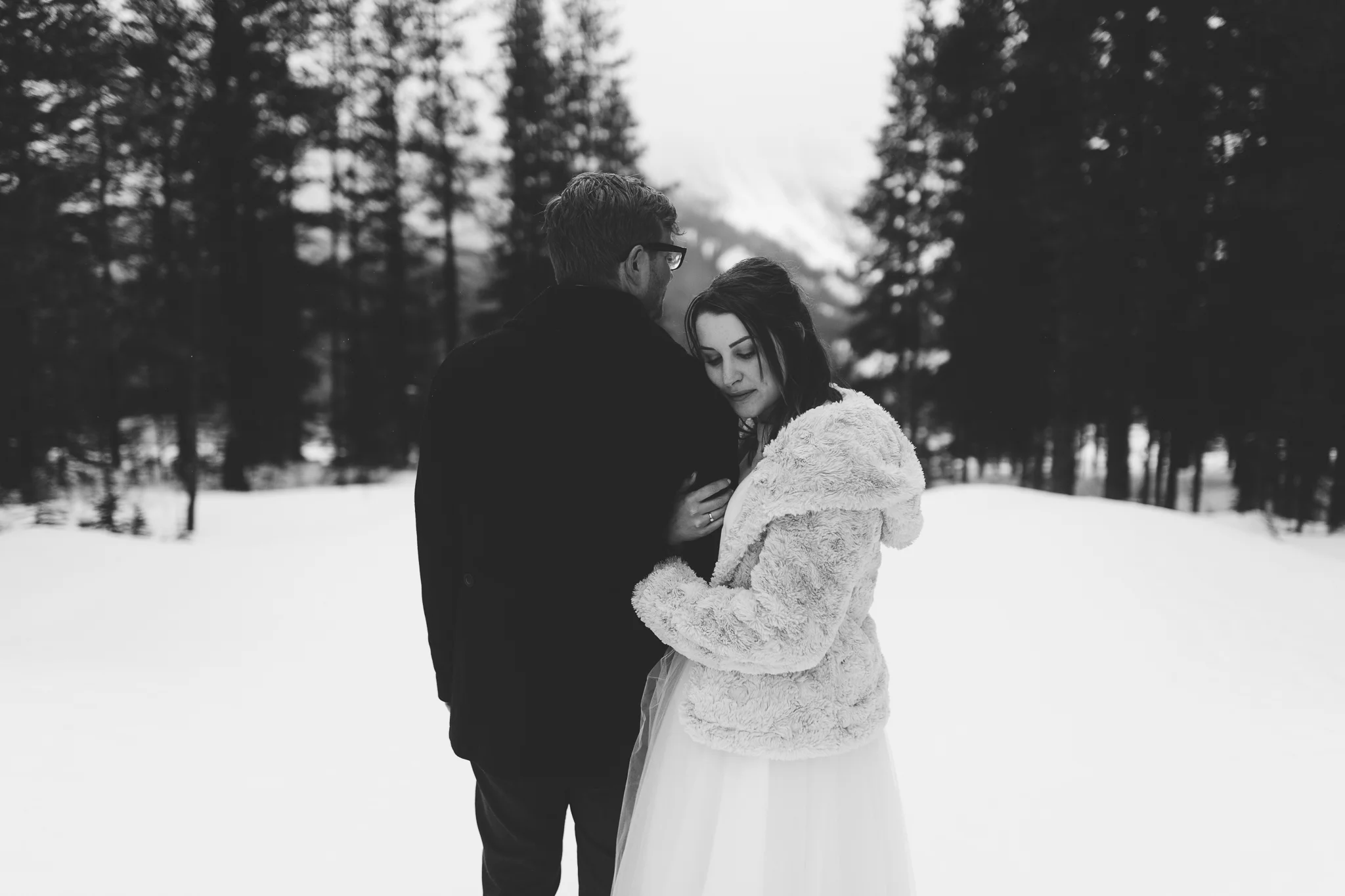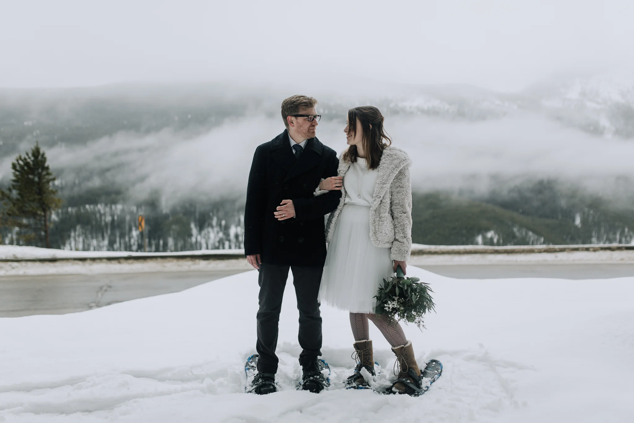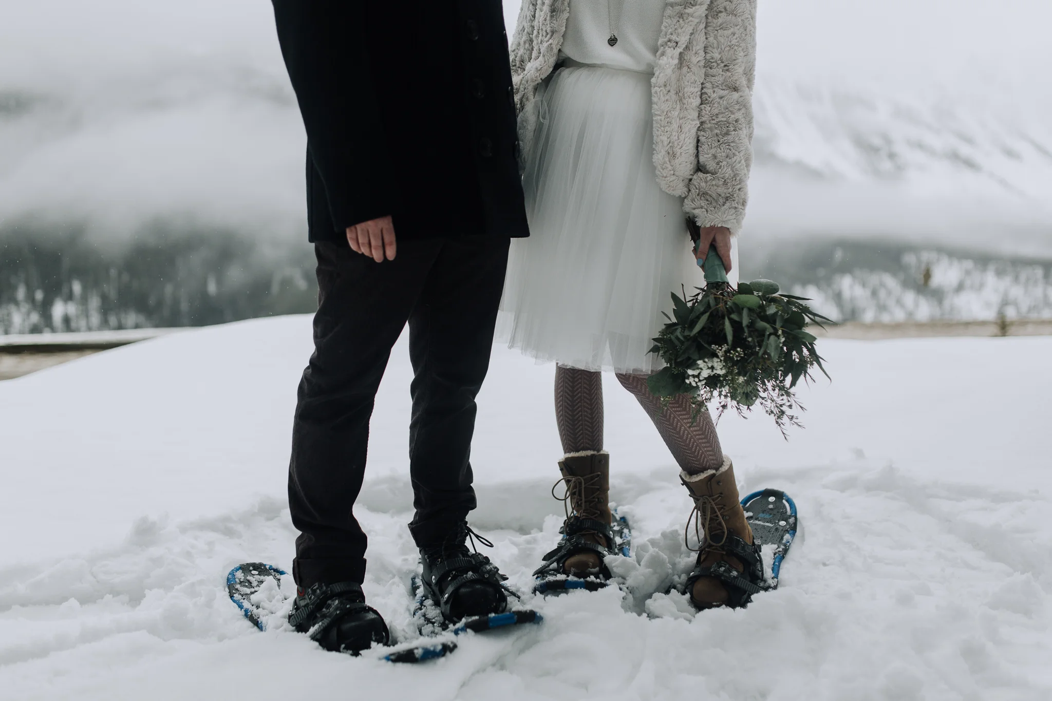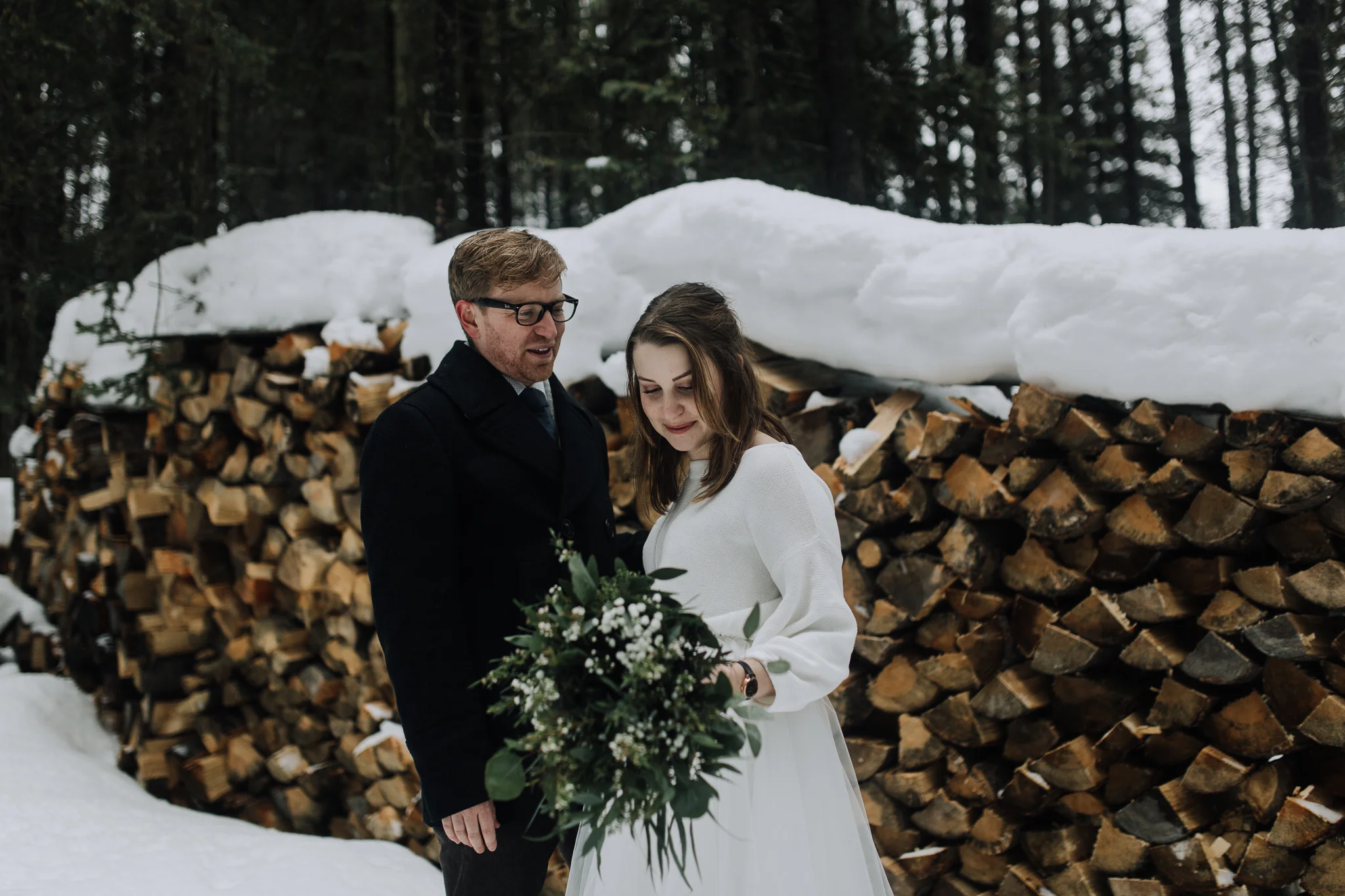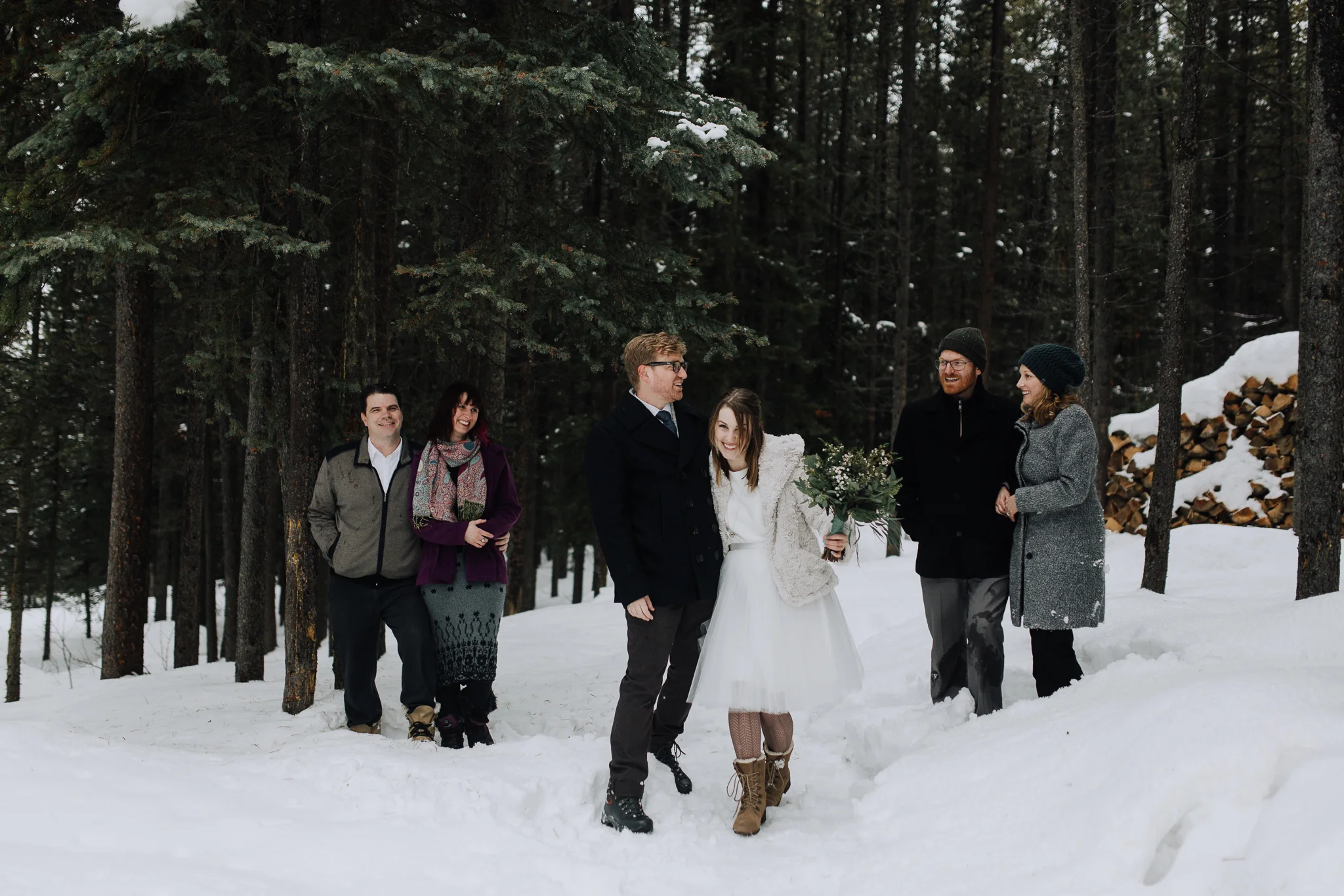 A few months ago I was contacted by Dawn & Rob about shooting their intimate Banff elopement at Storm Mountain Lodge. Hidden off the side of Highway 93 in Banff National Park, Storm Mountain Lodge is one of those intimate wedding venues that every photographer dreams of shooting at. Guests stay in individual log cabins scattered through the property. They are cosy and cute and the perfect location for a magical winter elopement in Banff. Dawn & Rob had discovered me through Instagram, which was a first for me! We met for coffee to chat about their Banff elopement plans and instantly hit it off. One of my favourite memories was when I got up to use the bathroom and came back to Rob exclaiming, "I know you've only been gone 2 minutes but we've already had a change of plans! We want you to join us for dinner at the lodge after the wedding!" That was when I began to learn just how friendly and inviting these two and their closest friends are. At no point during the day did I feel like "the photographer", more like an old friend third wheeling Rob & Dawn on a snowshoeing date through the snowy forest! The ceremony lasted a grand total of 7 minutes on the front porch of their cute cabin and was witnessed by myself and 3 other people. It was intimate and meaningful and just for the two of them, which accurately describes the entire day. I may have been the only single person at this Banff elopement, but being surrounded by such genuine and unconditional love was incredibly refreshing. I can only hope to encounter such a love myself one day! Congrats again, Rob and Dawn and I'll see you at the Loose Moose sometime soon!