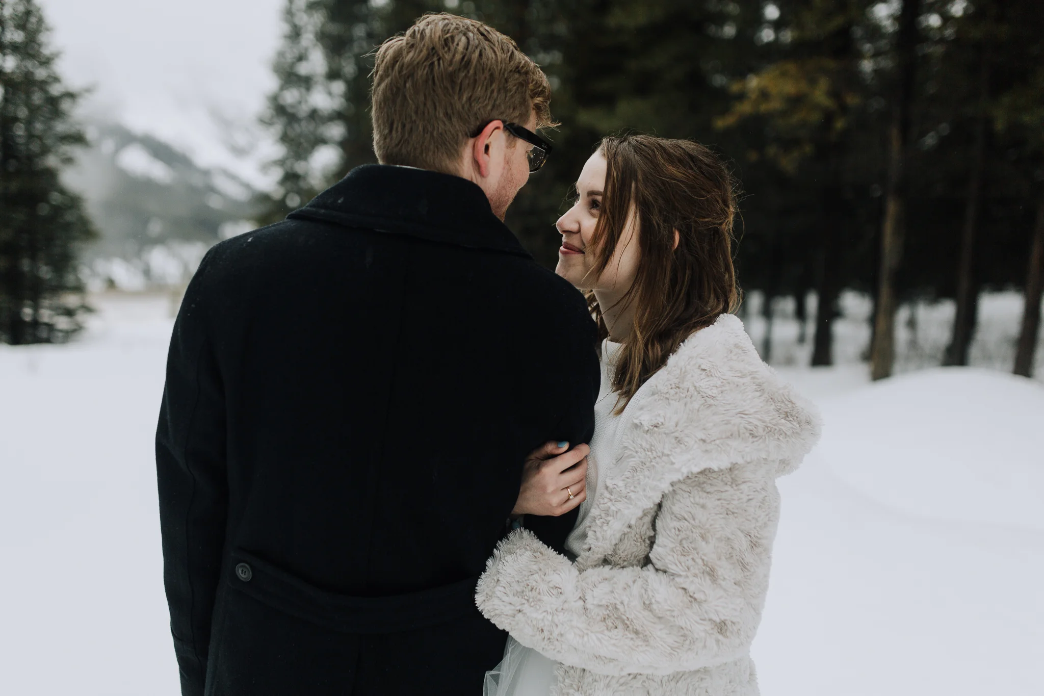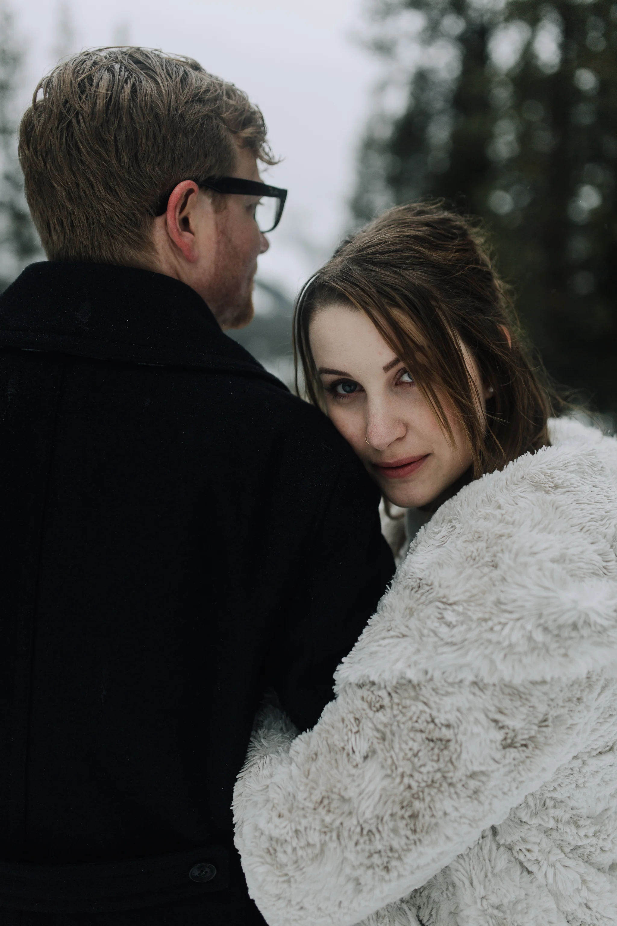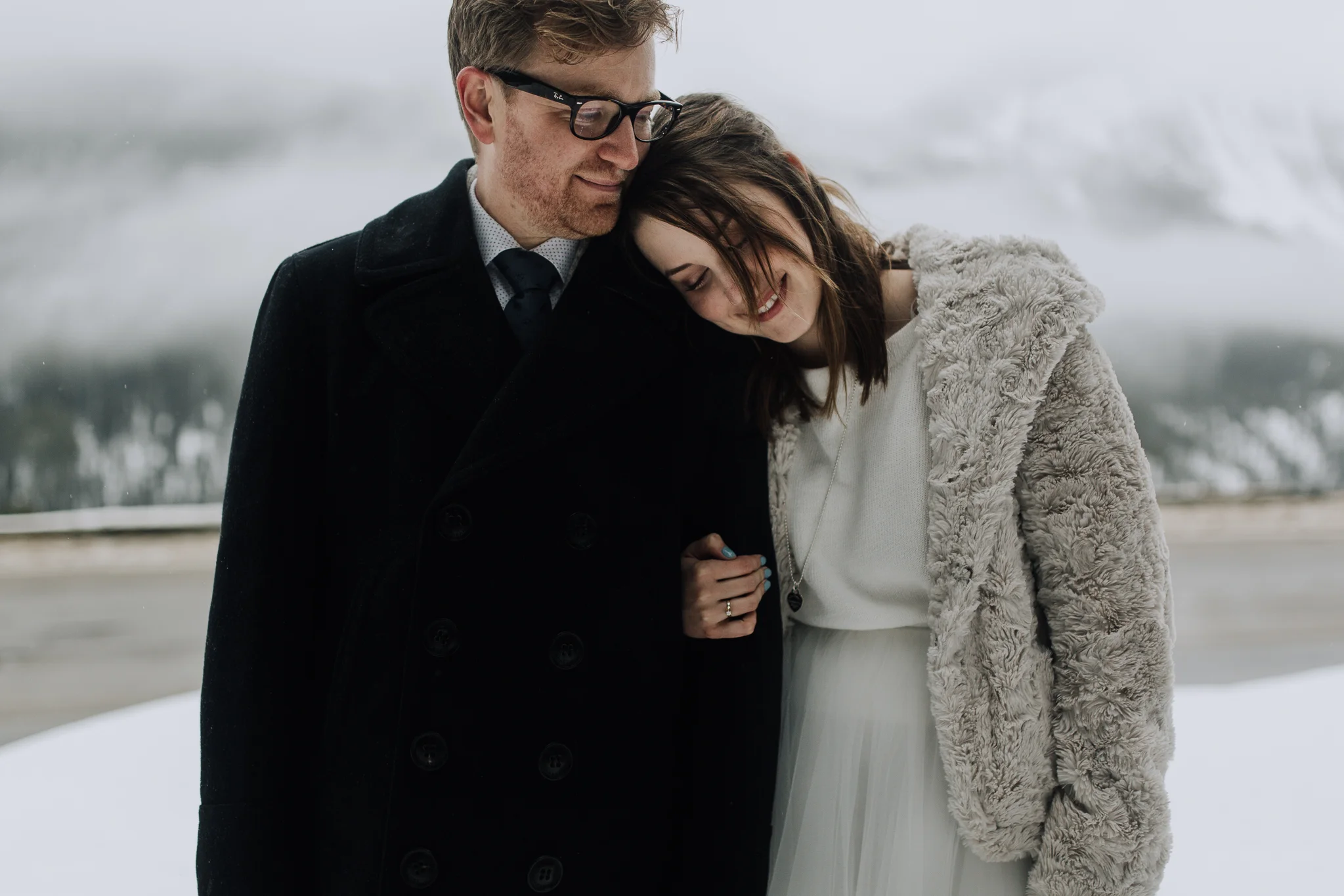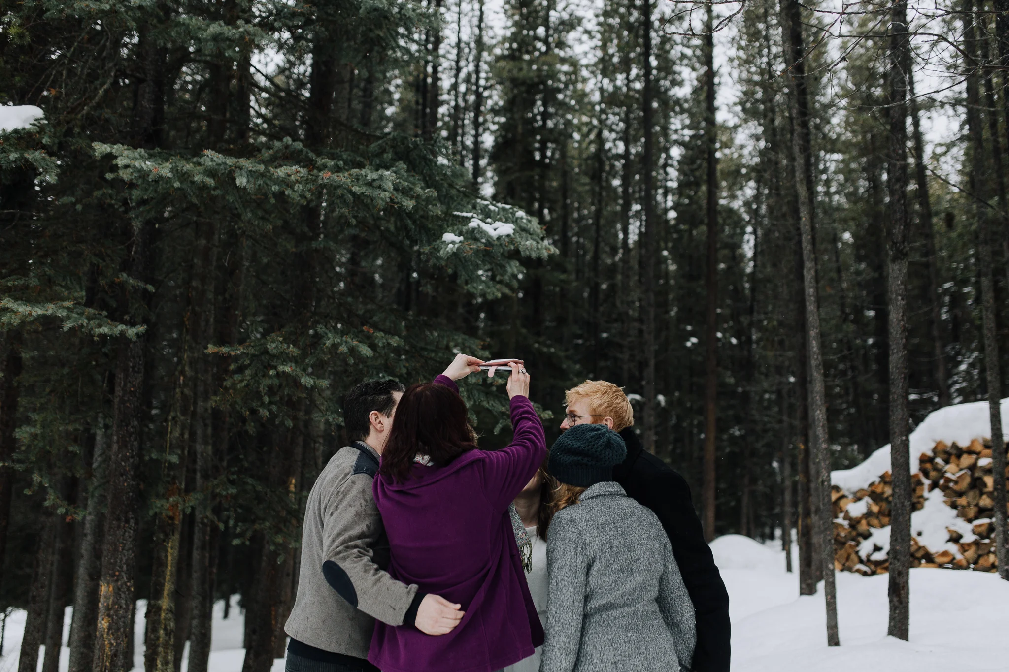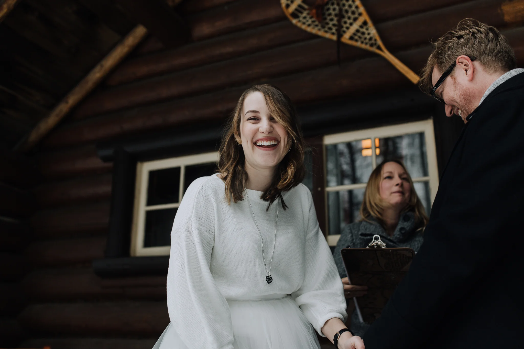 A few months ago I was contacted by Dawn & Rob about shooting their intimate Banff elopement at Storm Mountain Lodge. Hidden off the side of Highway 93 in Banff National Park, Storm Mountain Lodge is one of those intimate wedding venues that every photographer dreams of shooting at. Guests stay in individual log cabins scattered through the property. They are cosy and cute and the perfect location for a magical winter elopement in Banff. Dawn & Rob had discovered me through Instagram, which was a first for me! We met for coffee to chat about their Banff elopement plans and instantly hit it off. One of my favourite memories was when I got up to use the bathroom and came back to Rob exclaiming, "I know you've only been gone 2 minutes but we've already had a change of plans! We want you to join us for dinner at the lodge after the wedding!" That was when I began to learn just how friendly and inviting these two and their closest friends are. At no point during the day did I feel like "the photographer", more like an old friend third wheeling Rob & Dawn on a snowshoeing date through the snowy forest! The ceremony lasted a grand total of 7 minutes on the front porch of their cute cabin and was witnessed by myself and 3 other people. It was intimate and meaningful and just for the two of them, which accurately describes the entire day. I may have been the only single person at this Banff elopement, but being surrounded by such genuine and unconditional love was incredibly refreshing. I can only hope to encounter such a love myself one day! Congrats again, Rob and Dawn and I'll see you at the Loose Moose sometime soon!