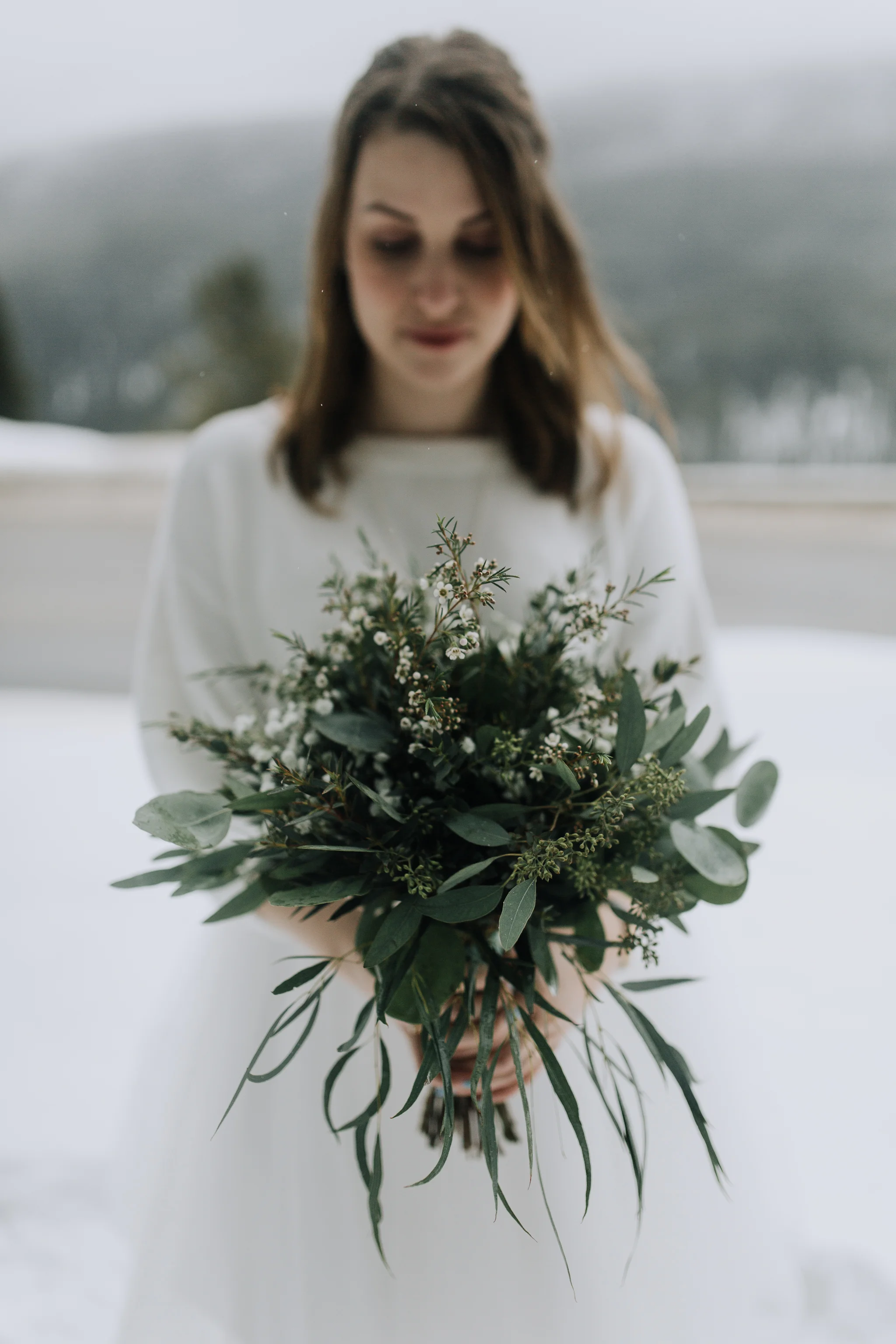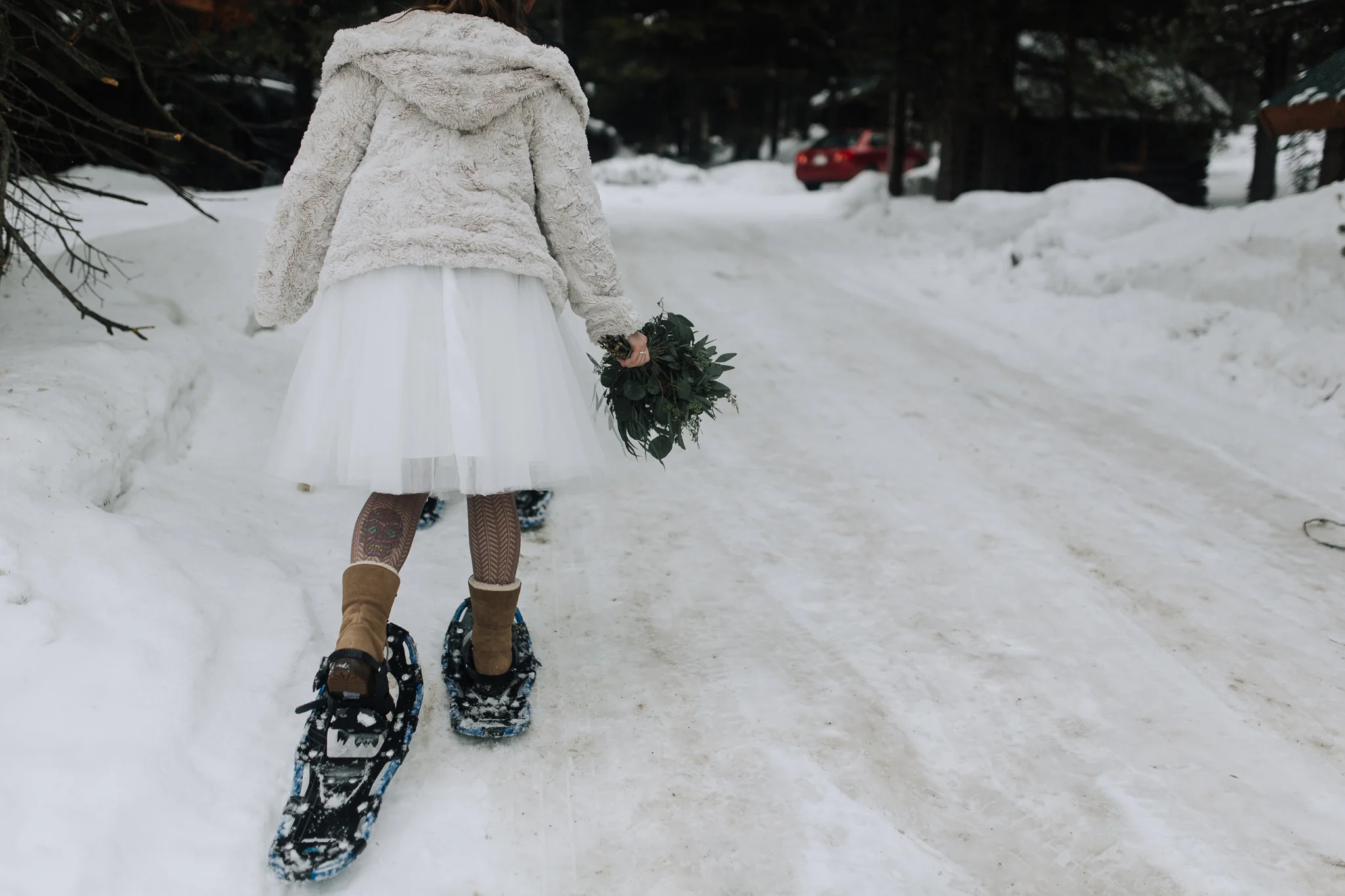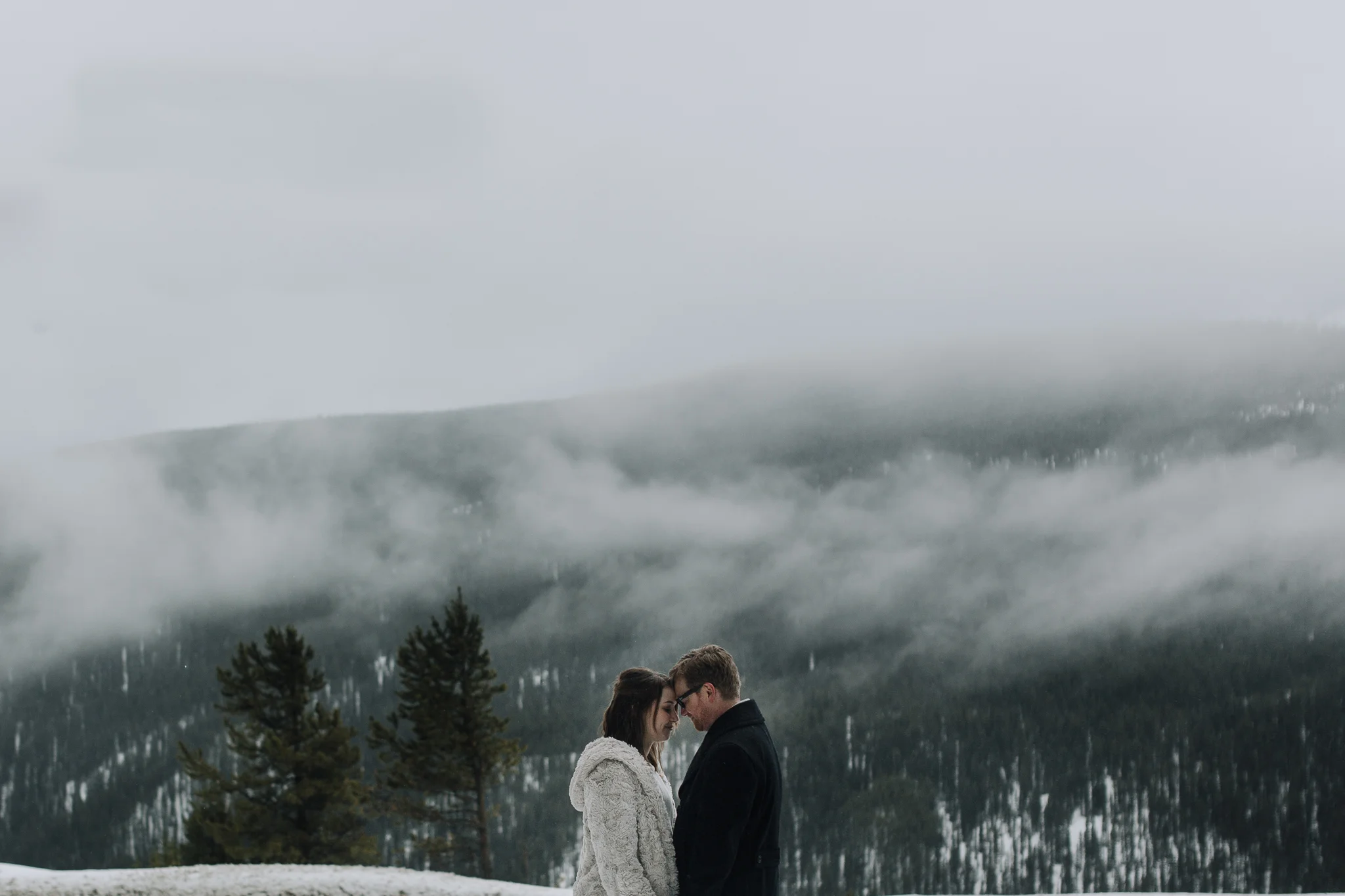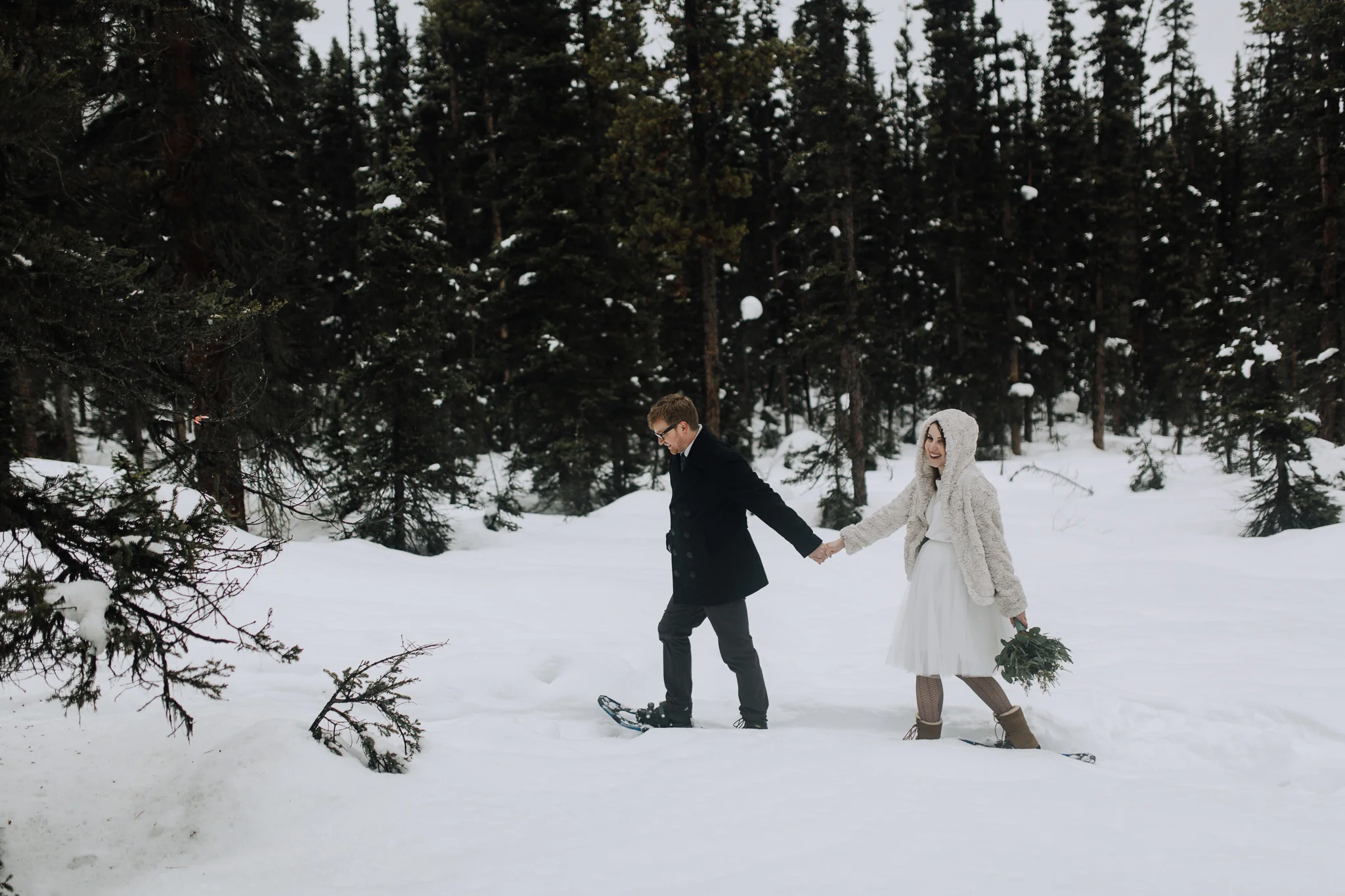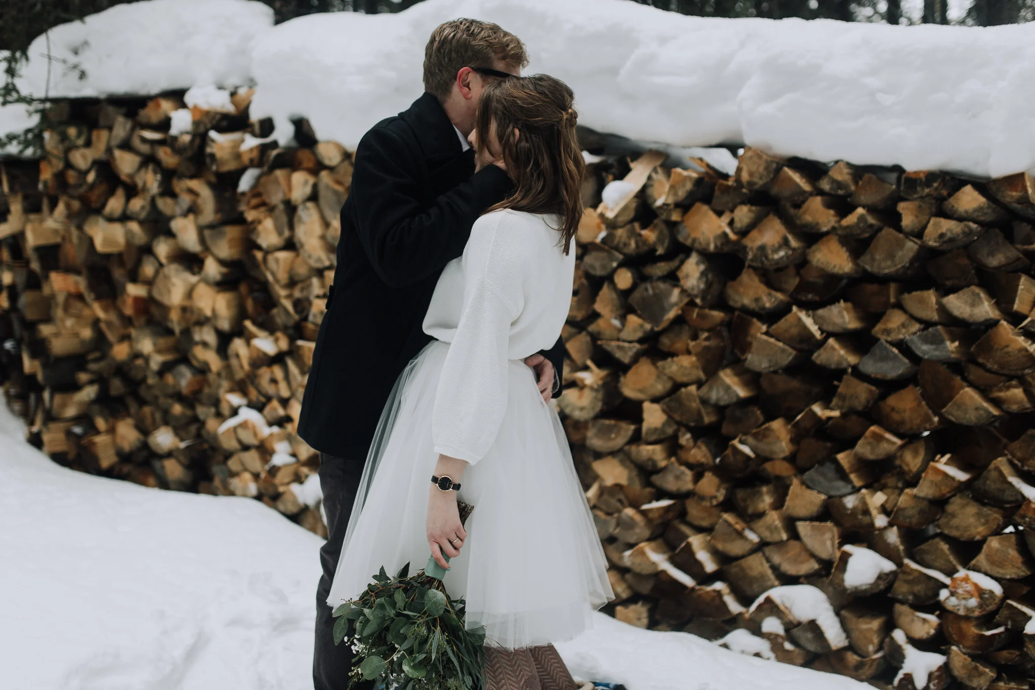 A few months ago I was contacted by Dawn & Rob about shooting their intimate Banff elopement at Storm Mountain Lodge. Hidden off the side of Highway 93 in Banff National Park, Storm Mountain Lodge is one of those intimate wedding venues that every photographer dreams of shooting at. Guests stay in individual log cabins scattered through the property. They are cosy and cute and the perfect location for a magical winter elopement in Banff. Dawn & Rob had discovered me through Instagram, which was a first for me! We met for coffee to chat about their Banff elopement plans and instantly hit it off. One of my favourite memories was when I got up to use the bathroom and came back to Rob exclaiming, "I know you've only been gone 2 minutes but we've already had a change of plans! We want you to join us for dinner at the lodge after the wedding!" That was when I began to learn just how friendly and inviting these two and their closest friends are. At no point during the day did I feel like "the photographer", more like an old friend third wheeling Rob & Dawn on a snowshoeing date through the snowy forest! The ceremony lasted a grand total of 7 minutes on the front porch of their cute cabin and was witnessed by myself and 3 other people. It was intimate and meaningful and just for the two of them, which accurately describes the entire day. I may have been the only single person at this Banff elopement, but being surrounded by such genuine and unconditional love was incredibly refreshing. I can only hope to encounter such a love myself one day! Congrats again, Rob and Dawn and I'll see you at the Loose Moose sometime soon!